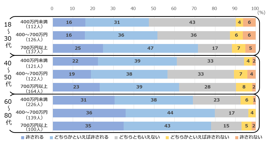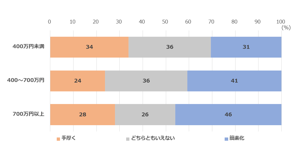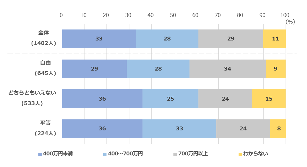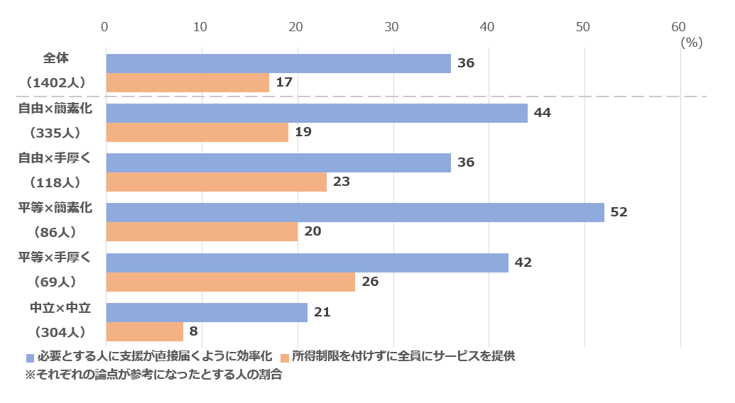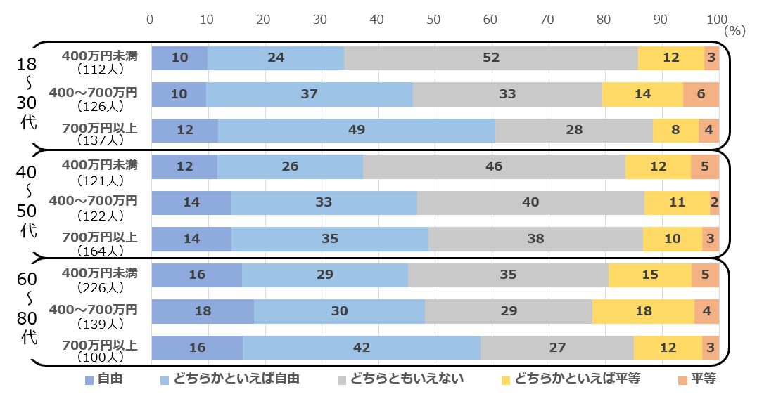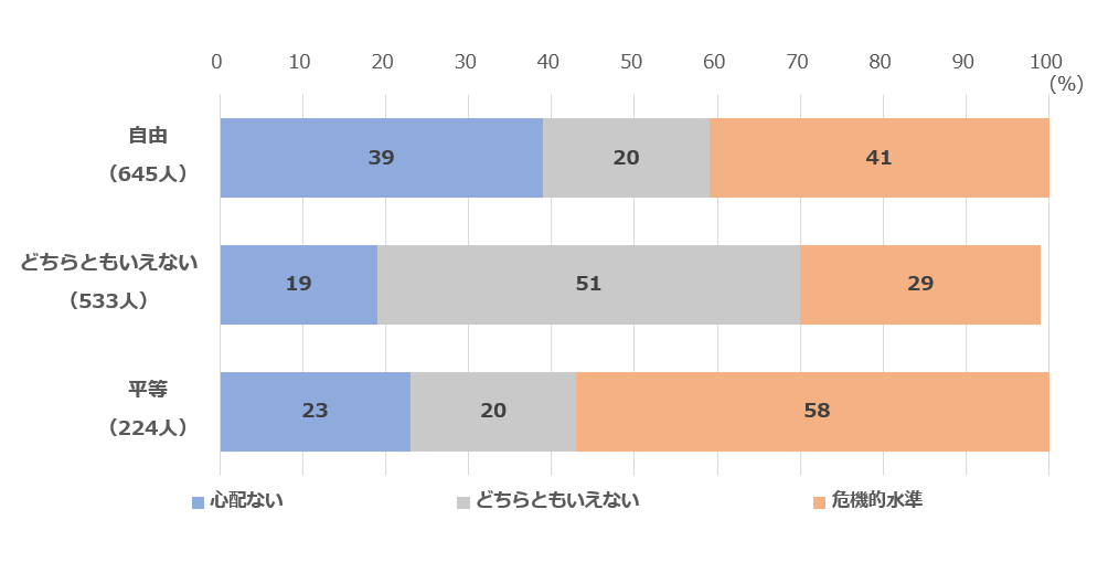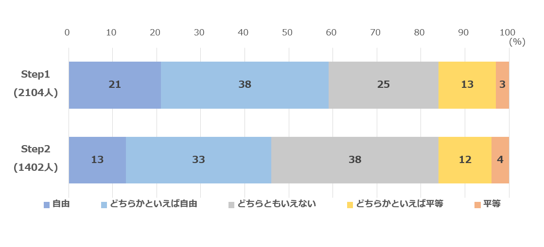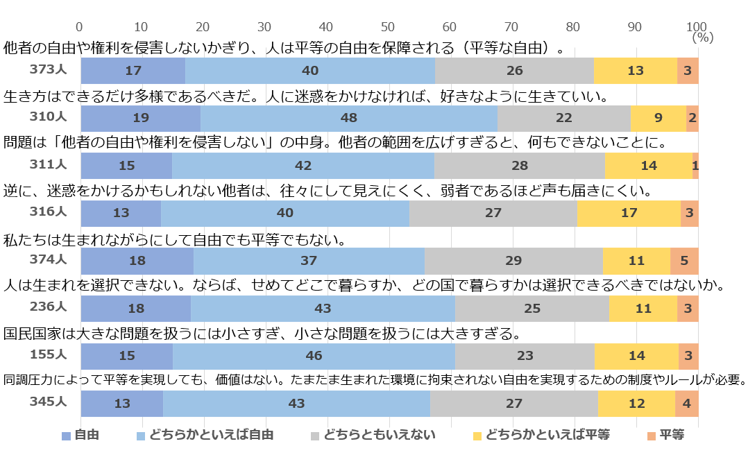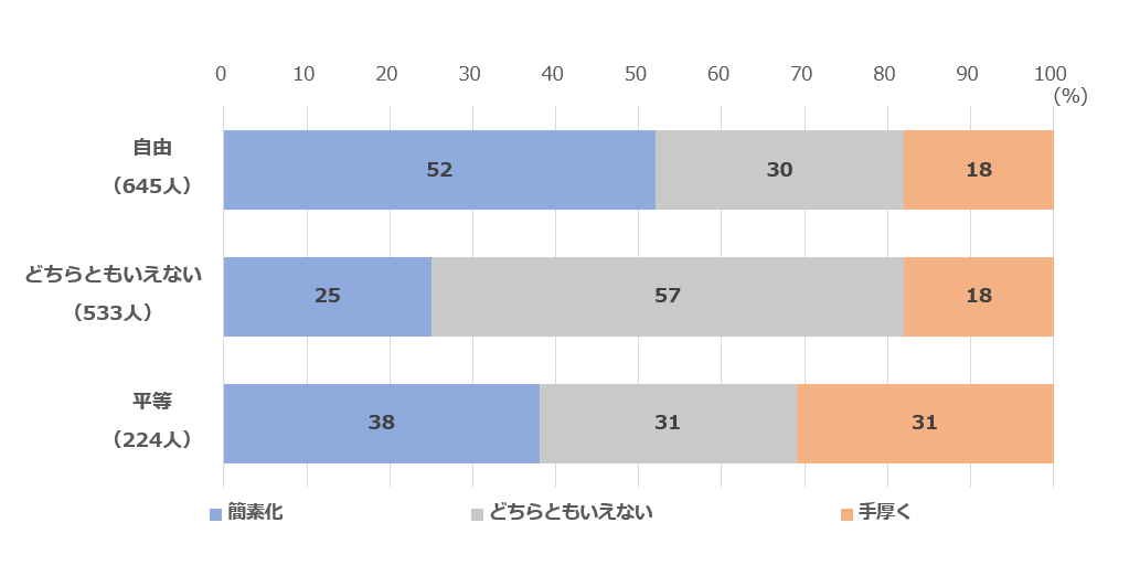 研究報告書 2022.03.09 『中央公論』2022年4月号にて引用された調査データ この記事は分で読めます シェア Tweet NIRA総合研究開発機構 概要 『中央公論』2022年4月号の「2000人調査から見えた日本人の『自由』と『平等』観」にて引用された調査データについて、詳細を報告する。NIRA総研では、自由と平等をテーマに、一般の人々の意見を集約するための調査を実施した。本調査では、「自由と平等のどちらを選ぶか」に加え、「コロナ対策のための個人の自由の制限は許されるか」など、個人の自由と公共のあり方について、人々がどのように考えているかを調査した。 PDFで読む (726.4KB) INDEX 大切だと思う政策課題 専門家の論考 意見A 重田園江さん(明治大学教授) 意見B 渡辺靖さん(慶応義塾大学教授) 自由か平等か 自由か平等かー年齢・世帯年収別の分布ー 「自由か平等か」でみた世帯年収の分布 コロナ対策のための個人の自由の制限は許されるか コロナ対策のための個人の自由の制限は許されるかー年齢・世帯年収別の分布ー 緊急事態における非常措置権限を認めるべきか 参考になった論点別の「自由か平等か」 「自由か平等か」でみた行政サービスのあり方 「自由か平等か」でみた行政サービス給付のあり方 現役世代(18ー60歳代)で平等を選んだ人の、行政サービスに対する考え 「自由か平等か」でみた財政規律の考え ポイント● 行政が取り組む主な政策課題の中では、「年金・医療」や「子育て・教育」といった社会保障に関連する分野が重要視されている。● 自由と平等のどちらかを選ぶとしたら、自由の方が平等よりもかなり多い。また、Step2で、専門家の意見を読んでもらってから同じ質問をしたところ、Step1よりも「どちらともいえない」という回答が増えた。● コロナ対策のためには個人の自由の制限は許されると考える人の方が、許されないと考える人より多く、過半数を占める。● 自由を選ぶ人は、行政サービスの簡素化を支持する人が多い。平等を選ぶ人は、手厚い行政サービスを支持する人の割合が他より多いが、行政サービスの簡素化を支持する人もほぼ同じくらいいる。自由と平等、簡素化と手厚くのどちらを選ぶかに関わらず、行政サービスのあり方は、ユニバーサルよりもターゲティングを支持する人が多い。 調査概要• 日本が直面する課題について解決策を探るためには、政策に関心を持つさまざまな人々の意見を集約し、それを踏まえた政策ビジョンを構築することが必要だ。その第1段階として、社会・経済に関するテーマに関して、一般の人々の意見を集約するための調査を実施した。• 本稿では、「自由と平等」に関する調査結果について報告する。• 本調査では、テーマに関する専門家の論考を読み、考える熟慮により、人々の態度がどう変化するかを検証するため、同一の回答者を対象に、2回のアンケート調査を行った。• Step1では、テーマに関する質問のほかに、社会・経済的属性や政策に対する考えなどを聞いた。• Step2では、始めに2名の専門家(重田園江氏と渡辺靖氏)の文章を調査対象者に読んだうえでアンケートに答えてもらい、読後に変化が出るのかについて調査をした。 研究体制谷口将紀 NIRA総研理事長/東京大学大学院法学政治学研究科教授宇野重規 NIRA総研理事/東京大学社会科学研究所教授神田玲子 NIRA総研理事・研究調査部長川本茉莉 NIRA総研研究コーディネーター・研究員(担当) 大切だと思う政策課題 1番大切だと思う政策課題では、「年金・医療」を選ぶ人が圧倒的に多い。1-5番目の累計では、「防災」「公共インフラの整備」が相対的に多くなる。 (注)『中央公論』2022年4月号「2000人調査から見えた日本人の『自由』と『平等』観」における図1 専門家の論考 Step2では、自由と平等に関する2人の専門家の論考を始めに提示し、それを読んでもらったうえで、アンケートに回答してもらった。 意見A 重田園江さん(明治大学教授) 「平等な自由」という考えがあります。これは、他の人の自由や権利を侵害しないかぎり、人は平等に自由を保障される、という考えです。ここで平等は、たとえば貧富の差をなるべく少なくしよう、という場合の平等とは異なっています。後者の場合、人々の生存条件をできるだけ等しくするという発想です。これに対して平等な自由においては、人の生き方はできるだけ多様であるべきなのです。人に迷惑をかけなければ、好きなように生きていい。 ただしここで、他者の権利を侵害しない、の中身が問題になります。差別主義者がSNSで差別を吹聴するのはアウトです。夜中に騒音を出すのもダメでしょう。では無人島で騒ぐのはどうでしょう。そのときペットボトル飲料をたくさん飲んで海に捨てたとしたら。環境負荷は「他者」への侵害でしょうか。他者の範囲にどこまでを入れるべきなのでしょう。他者をあまりに広げすぎると、平等な自由は結局誰も何もできないことにつながりかねません。他方で迷惑をかけるかもしれない他