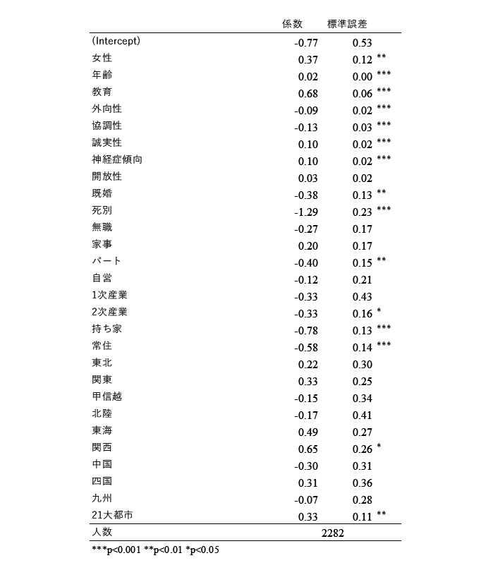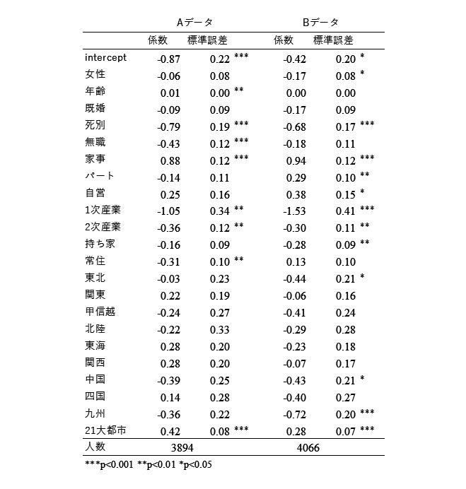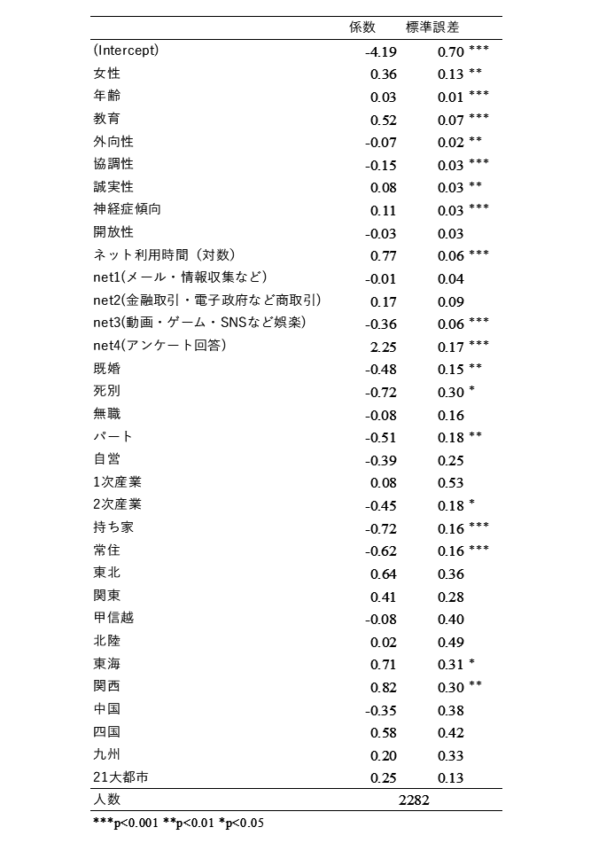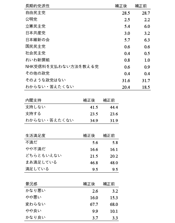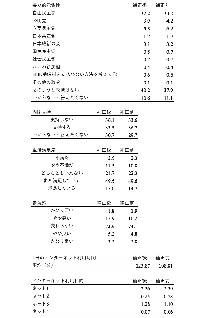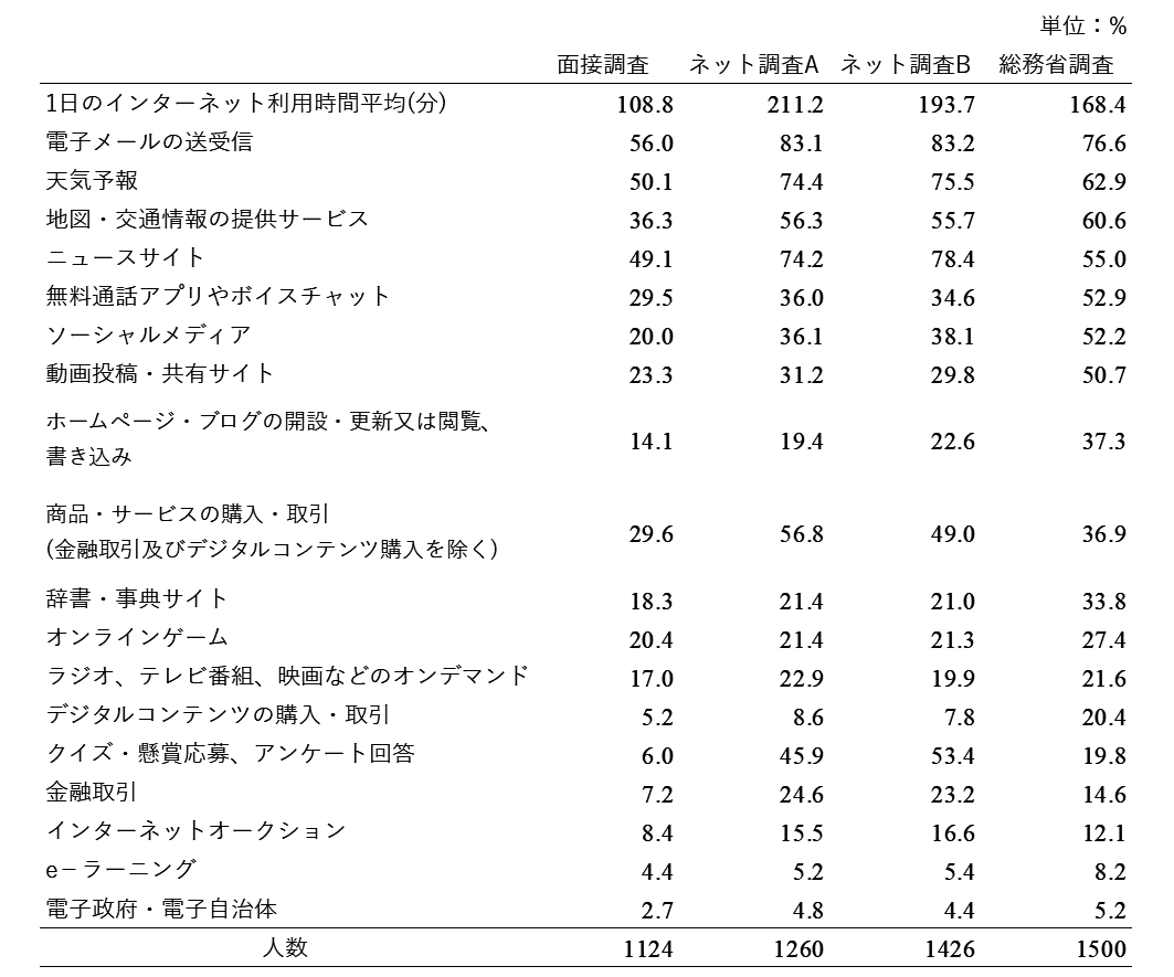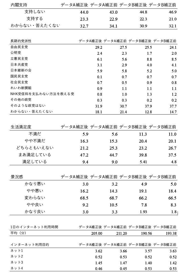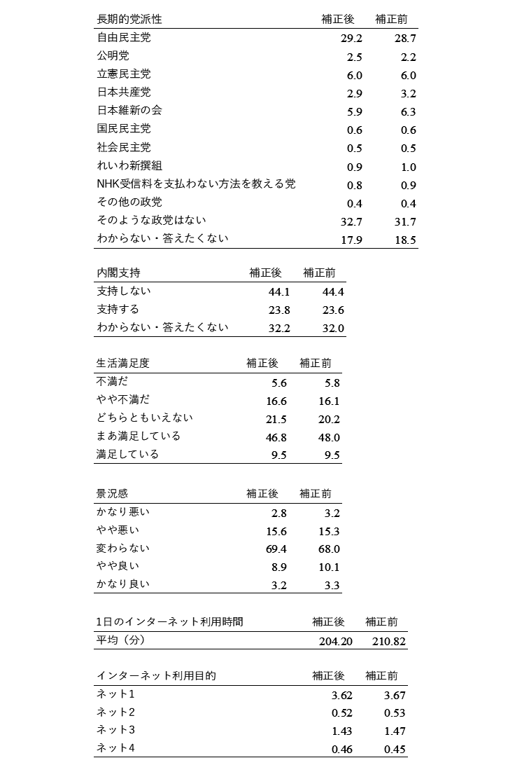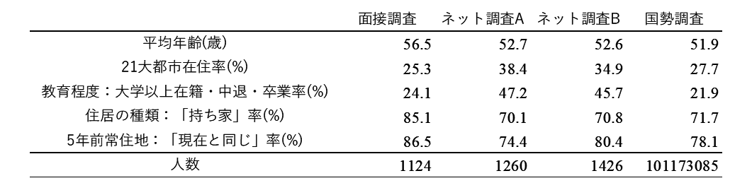 English version 研究報告書 2022.03.31 インターネット調査におけるバイアス国勢調査・面接調査を利用した比較検討 この記事は分で読めます シェア Tweet 谷口将紀 NIRA総合研究開発機構理事長/東京大学大学院法学政治学研究科教授 大森翔子 NIRA総合研究開発機構研究コーディネーター・研究員 ※本調査の個票データはこちら 概要 無作為抽出法により調査者を抽出する面接調査・郵送調査と比較して、インターネット調査は、概して費用が安いため、幅広く利用されるようになっている。しかし、インターネット調査には、特にサンプルの代表性について疑義が呈されてきた。 本プロジェクトでは、インターネット調査回答者の特性を明らかにするために、無作為抽出に基づく面接調査と、性別・年齢層で回収目標数を割り付けたインターネット調査を、同一の調査項目で、かつ、全く同じタイミングで実施し、両者および国勢調査との比較を行った。 分析の結果、国勢調査結果と比較して、インターネット調査には居住地域や学歴といった項目で偏りが見られたほか、面接調査にも持ち家率に偏りが見られた。また、国勢調査の調査票情報を用いた傾向スコアに基づく補正を行ったところ、基本的属性での補正には限界がありながらも、インターネット利用時間等の変数に対しては一定程度の補正効果があることがわかった。 エグゼクティブサマリーを読む (2.1MB) 全文を読む (3.5MB) Executive Summary (224.5KB) INDEX 第1章 はじめに 1.イントロダクション 2.問題の所在 3.本プロジェクトの目的とリサーチクエスチョンの設定 第2章 研究方法 1.調査概要と記述統計 2.各調査データにおける質問回答分布の乖離 3.調査データの補正方法 第3章 分析と結果 1.従来型補正 2.国勢調査の調査票データを用いた直接補正 第4章 結論と暫定的対策 付録 付録A 各調査における質問と選択肢 付録B 回帰分析における変数の定義 ポイント●インターネット調査回答者の特性を明らかにするため、NIRA総合研究開発機構では、同じ質問項目によって構成される面接調査とインターネット調査を同時に実施し、両者および国勢調査結果との比較を行った。●性別と年齢による割り付けを行った場合においても、インターネット調査の回答者には、国勢調査の人口構成よりも大都市居住者が多く、学歴も高い傾向がある。また、サティスファイサー(Satisficer、省力回答者)と呼ばれる、でたらめな回答を行う者が9~16%含まれる。●無作為抽出に基づいて実施した面接調査にも、日本人全体と比べて安定した居住環境にある人が過大代表されやすいバイアスがある。すなわち、実際よりも持ち家率が高く、転居せずに同じ場所に住み続けている人の割合が高い。●国勢調査データを基に、傾向スコア法という補正方法を用いてインターネット調査に重みづけを行ったところ、面接調査・インターネット調査ともに長期的党派性(政党支持率)、内閣支持率、生活満足度、景況感などの分布には大きな変化は見られなかった。一方で、1日当たりのインターネット利用時間の平均値には面接調査で15分以上、インターネット調査でも数分程度の補正効果が生じた。●本プロジェクトの結果、今後の社会調査に対する示唆としては、以下の諸点を挙げられる。 ①無作為抽出に基づく調査、特に面接調査を行う場合には、質問項目に居住形態や移転の有無など、国勢調査と同一の項目を含めておき、レイキング法などの事後補正を行うことで、バイアスを一定程度補正できる。 ②インターネット調査を行うときには、事前に回収目標数の割り付けを行うだけでなく、サティスファイサーを取り除いた後に少なくとも性別・年齢・居住地域の構成比が国勢調査とそろえられるように、回収目標数を多めに設定しておくとよい。 ③インターネット調査によって計測したい事柄が、調査回答者が(調査モニターに登録するような)インターネットユーザーであることによって影響される場合(例、テレワーク利用動向、メタバース普及率など)は、インターネット利用時間などを実際の統計に合わせ、適切な事後補正を施すべきである。 ④1回限りのインターネット調査で「知りたいもの」を計測できるという過度な期待はしないほうがよい。同一方法での調査を繰り返すことにより、前回との変化(例、内閣支持率の増減)を通じた世論の「観測」や、バイアスの傾向(例、調査に基づく得票率予測と選挙結果の差)理解を通じた世論の「推測」が可能になる。 図表表2-1 本プロジェクトの調査概要表2-2 基本的属性項目における調査間の差異表2-3 基本的属性項目以外における調査間の差異表2-4 国勢調査サンプルデータの記述統計表3-1 Aデータと面接調査データをマージしたロジスティック回帰分析結果:モデル1表3-2 モデル1を用いたAデータの補正前・補正後の分布と平均(面接調査データに合わせた補正)表3-3 Aデータと面接調査データをマージしたロジスティック回帰分析結果:モデル2表3-4 モデル2を用いたAデータの補正