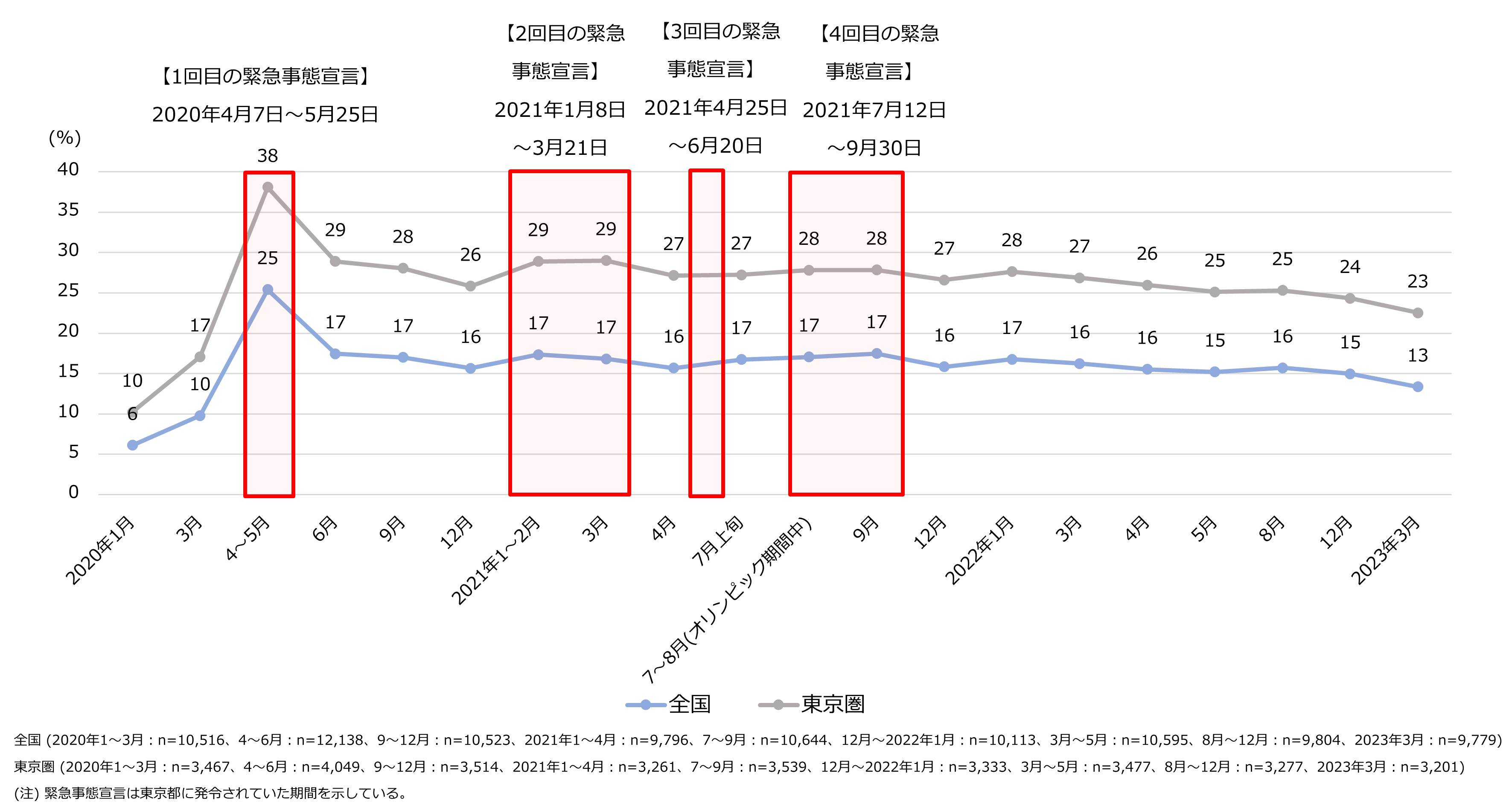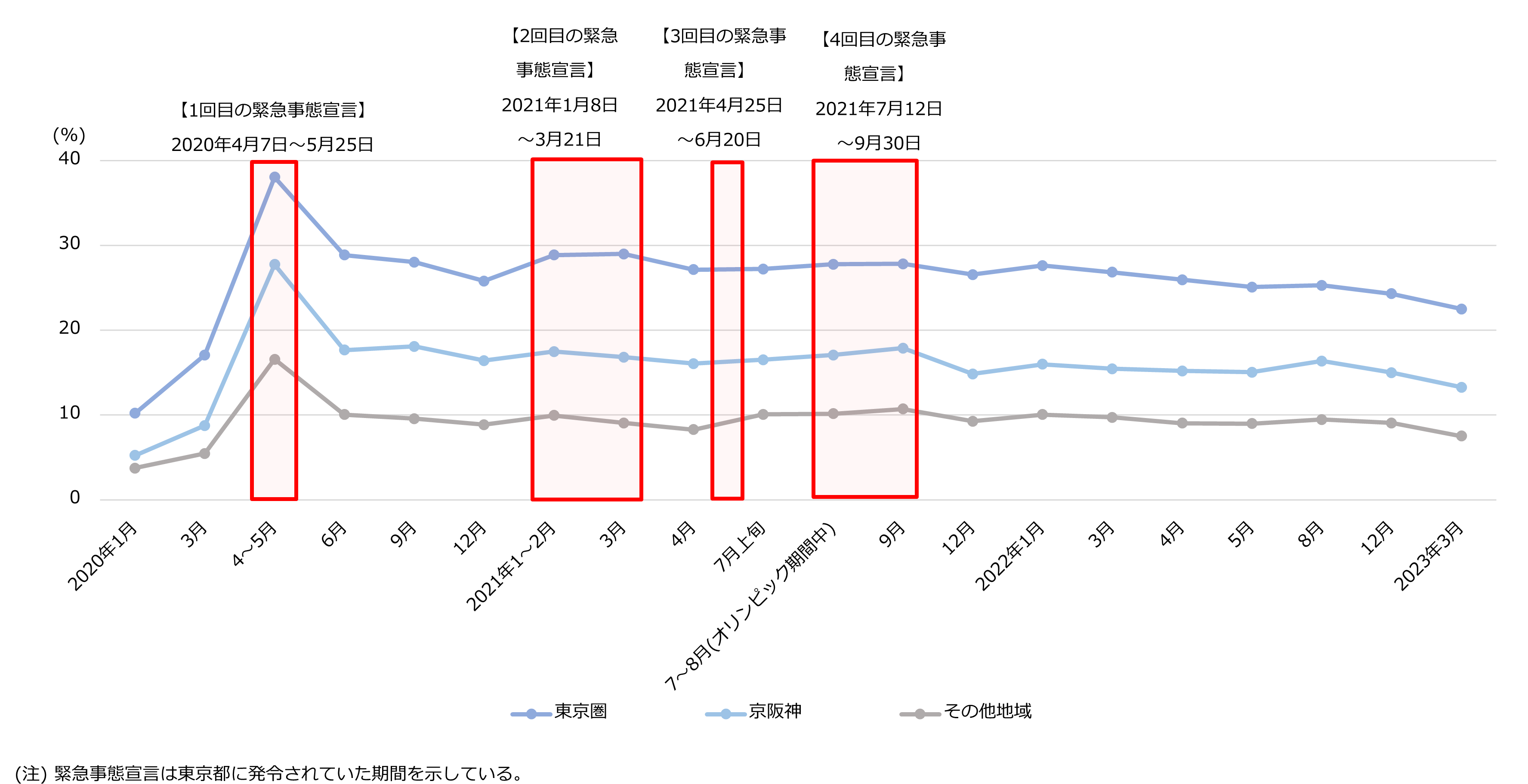 全国のテレワーク利用率の推移は、第1回目の緊急事態宣言が出された202045月は25%まで大幅に上昇したが、20206月の緊急事態宣言の解除後には17%に急速に低下した。その後の緊急事態宣言や東京オリンピック開催時期、オミクロン株による感染拡大を受けた20221月以降もおおむね横ばいで推移していたが、このところ低下し、20233月時点は13%となった(注3)東京圏(東京都・神奈川県・千葉県・埼玉県)のテレワーク利用率(居住地ベース)も、全国と同様、直近で低下し、23%となった。