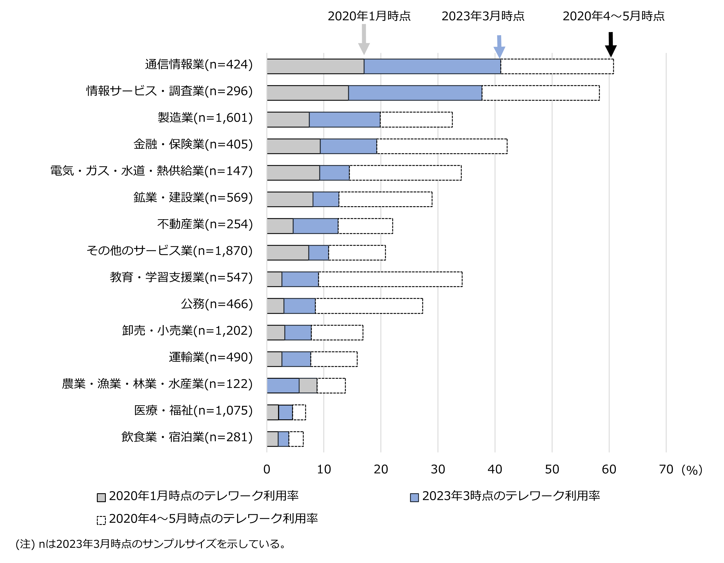 産業別に推移をみると(図1-2-1)、2023年3月時点でテレワーク利用率が高い産業は、「通信情報業」、「情報サービス・調査業」、「製造業」となった。他方、テレワーク利用率が低い産業として、「農業・漁業・林業・水産業」、「医療・福祉」、「飲食業・宿泊業」があげられる。