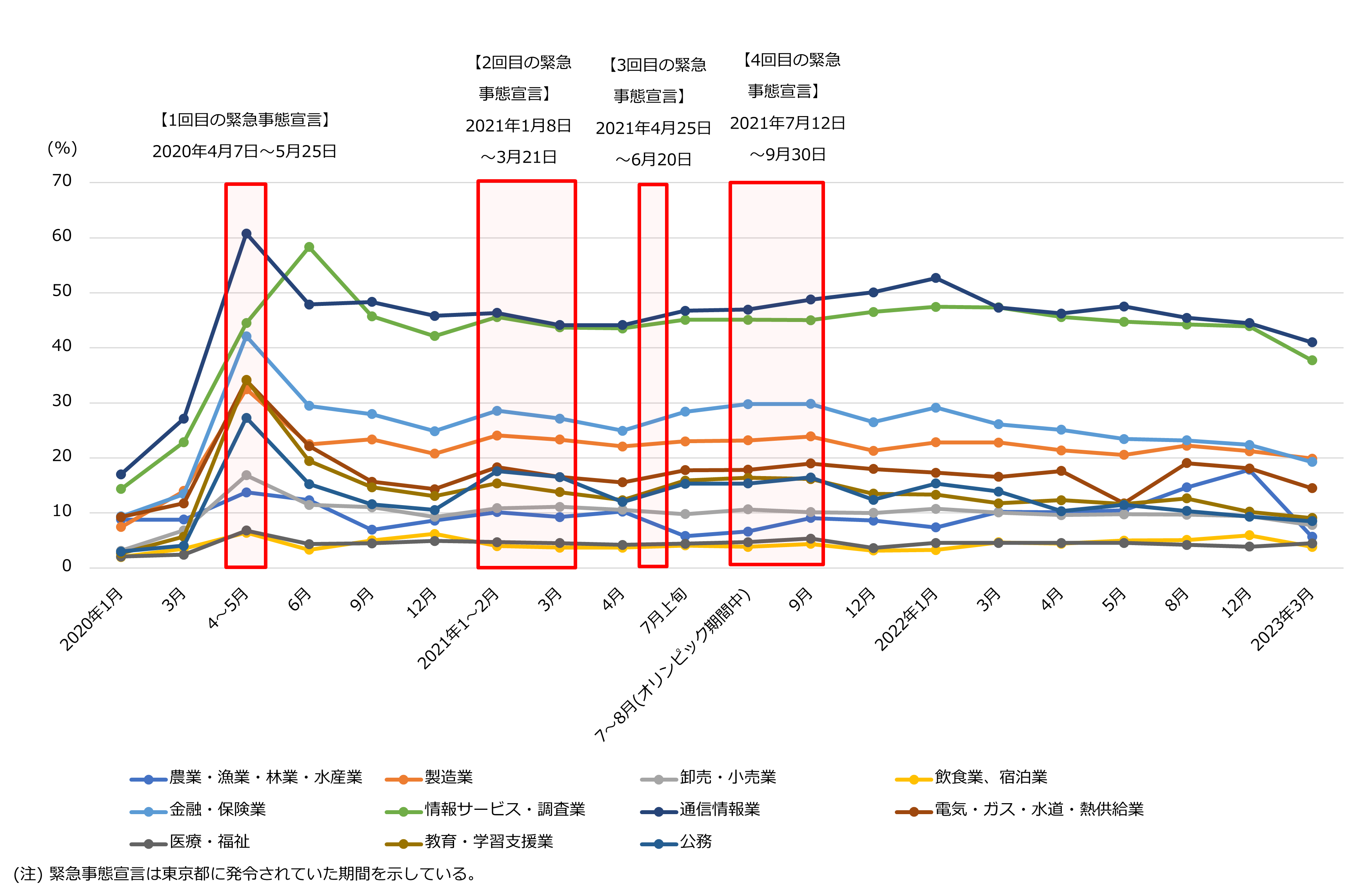 3 各時期の詳細結果については、202013月は第1回調査、46月の結果は第2回調査、912月の結果は第3回調査、202114月は第4回調査、79月は第5回調査、202112月~20221月は第6回調査、202235月は第7回調査、812月は第8回調査の報告書を参照されたい。第1回調査結果:大久保敏弘・NIRA総合研究開発機構(2020)「新型コロナウイルスの感染拡大がテレワークを活用した働き方、生活・意識などに及ぼす影響に関するアンケート調査結果に関する報告書」2回調査結果:大久保敏弘・NIRA総合研究開発機構(2020)「第2回テレワークに関する就業者実態調査報告書」3回調査結果:大久保敏弘・NIRA総合研究開発機構(2021)「第3回テレワークに関する就業者実態調査報告書」4回調査結果:大久保敏弘・NIRA総合研究開発機構(2021)「第4回テレワークに関する就業者実態調査報告書」5回調査結果:大久保敏弘・NIRA総合研究開発機構(2021)「第5回テレワークに関する就業者実態調査報告(速報)」6回調査結果:大久保敏弘・NIRA総合研究開発機構(2022)「第6回テレワークに関する就業者実態調査報告(速報)」7回調査結果:大久保敏弘・NIRA総合研究開発機構(2022)「第7回テレワークに関する就業者実態調査(速報)-『ウクライナ危機をめぐる安全保障に関する意識調査』を含む-」8回調査結果:大久保敏弘・NIRA総合研究開発機構(2023)「第8回テレワークに関する就業者実態調査報告(速報)-『ウクライナ危機をめぐる安全保障に関する意識調査』を含む-」 3 各時期の詳細結果については、202013月は第1回調査、46月の結果は第2回調査、912月の結果は第3回調査、202114月は第4回調査、79月は第5回調査、202112月~20221月は第6回調査、202235月は第7回調査、812月は第8回調査の報告書を参照されたい。第1回調査結果:大久保敏弘・NIRA総合研究開発機構(2020)「新型コロナウイルスの感染拡大がテレワークを活用した働き方、生活・意識などに及ぼす影響に関するアンケート調査結果に関する報告書」2回調査結果:大久保敏弘・NIRA総合研究開発機構(2020)「第2回テレワークに関する就業者実態調査報告書」3回調査結果:大久保敏弘・NIRA総合研究開発機構(2021)「第3回テレワークに関する就業者実態調査報告書」4回調査結果:大久保敏弘・NIRA総合研究開発機構(2021)「第4回テレワークに関する就業者実態調査報告書」5回調査結果:大久保敏弘・NIRA総合研究開発機構(2021)「第5回テレワークに関する就業者実態調査報告(速報)」6回調査結果:大久保敏弘・NIRA総合研究開発機構(2022)「第6回テレワークに関する就業者実態調査報告(速報)」7回調査結果:大久保敏弘・NIRA総合研究開発機構(2022)「第7回テレワークに関する就業者実態調査(速報)-『ウクライナ危機をめぐる安全保障に関する意識調査』を含む-」8回調査結果:大久保敏弘・NIRA総合研究開発機構(2023)「第8回テレワークに関する就業者実態調査報告(速報)-『ウクライナ危機をめぐる安全保障に関する意識調査』を含む-」