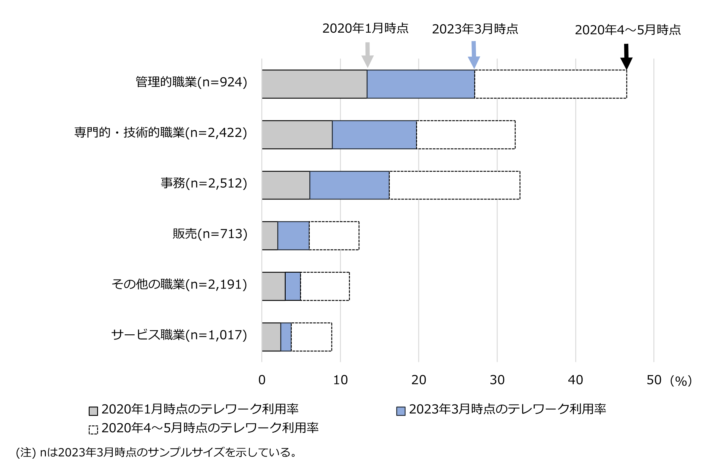 職業別に推移(注4)をみると(図1-3-1)20233月時点でテレワーク利用率が高い職業は、「管理的職業」、「専門的・技術的職業」、「事務」となった。他方、テレワーク利用率が低い職業として、「その他の職業」、「販売」、「サービス職業」があげられる。なお、「その他の職業」には、保安、農林漁業、生産工程、輸送・機械運転、建設・採掘、運搬・清掃・包装等、分類不能の職業に従事する者が含まれている。