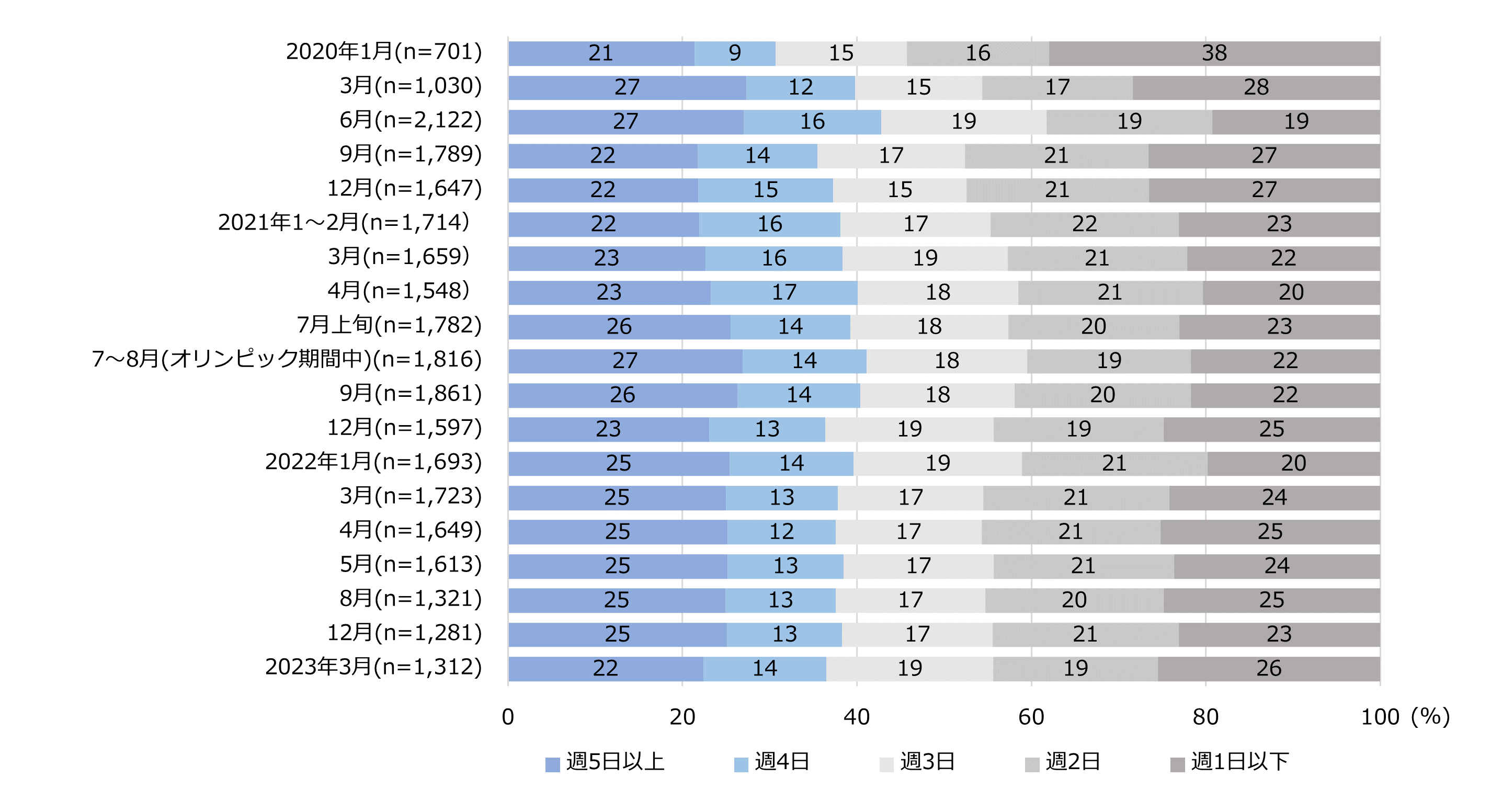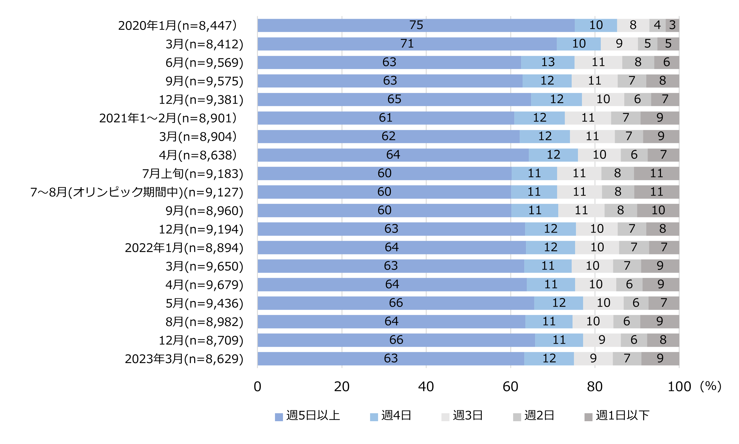 通常の職場で勤務している人(テレワーク利用者含む)の出社頻度の推移をみると(図2-1)20221月以降、目立った変化はなく、同程度の推移している。