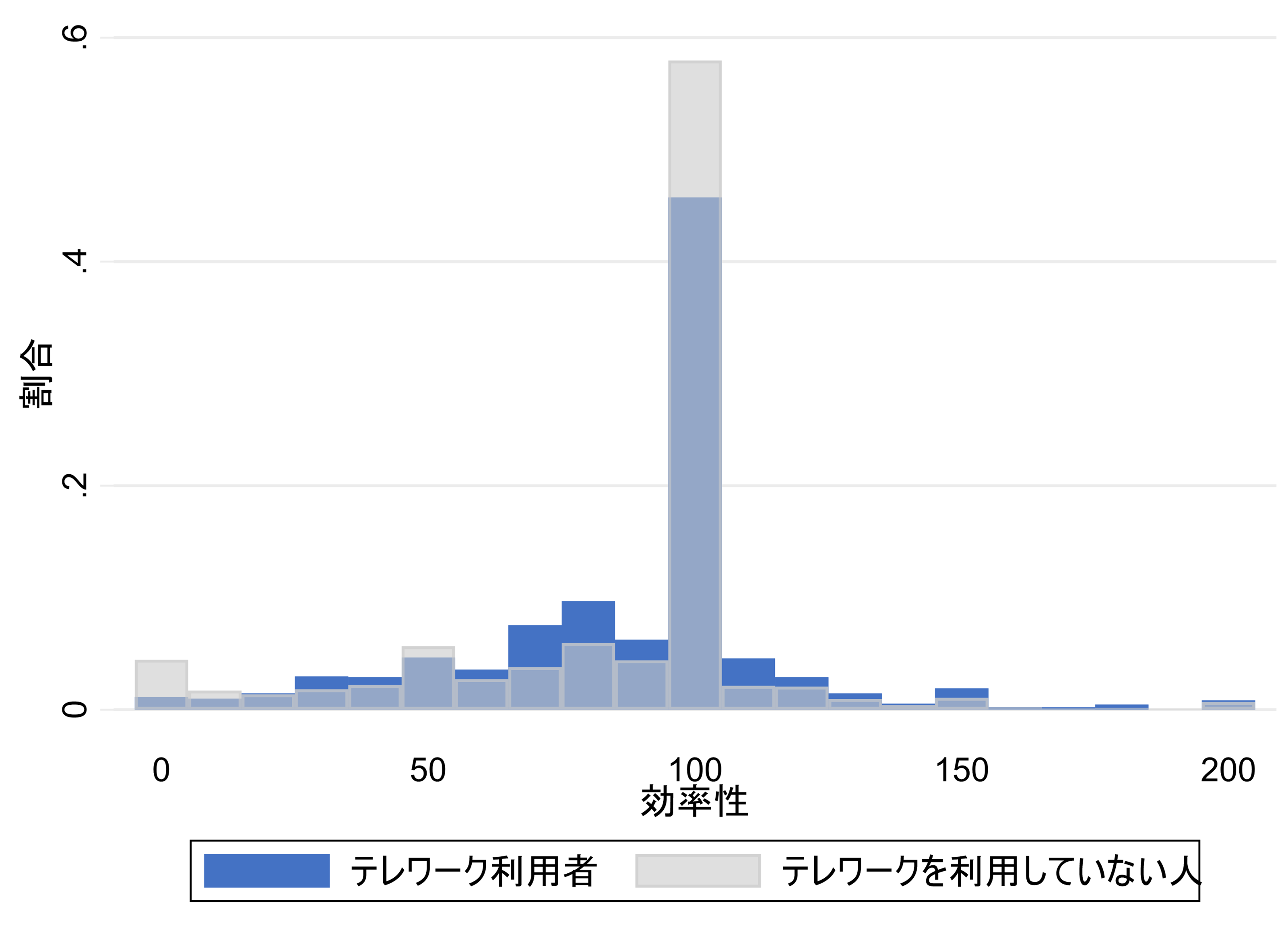 Q6の回答の分布をテレワーク利用別にみると、図3-1のようになった。テレワーク利用者は、テレワークを利用していない人に比べて、100と回答した人の割合は低く、6090110120と回答した人の割合が高くなっている。テレワークにより、仕事を効率的にできる人と、そうではない人がいることが伺える(注5)