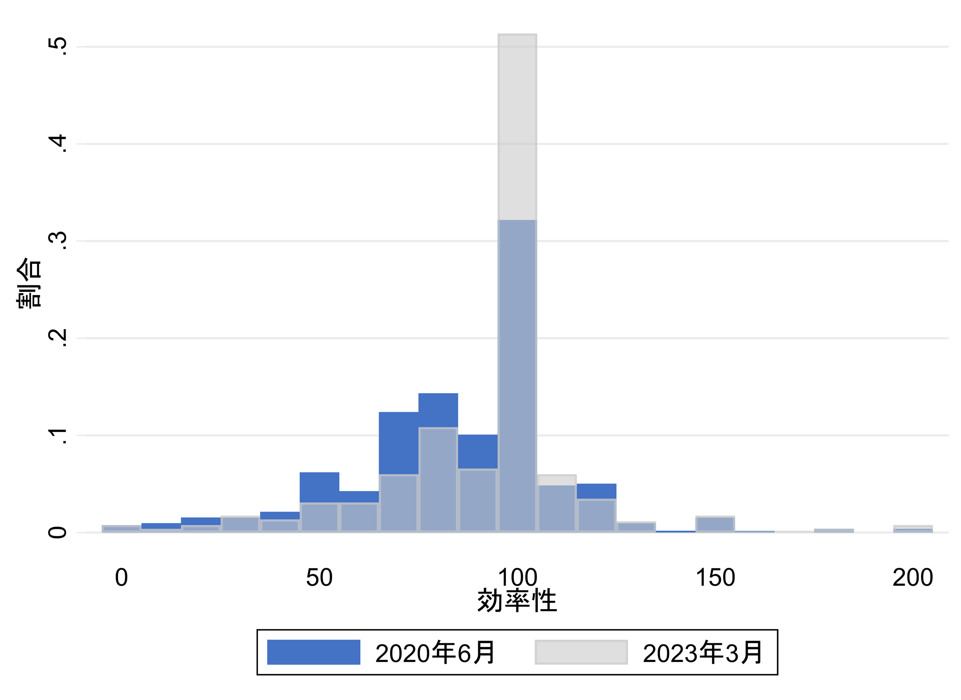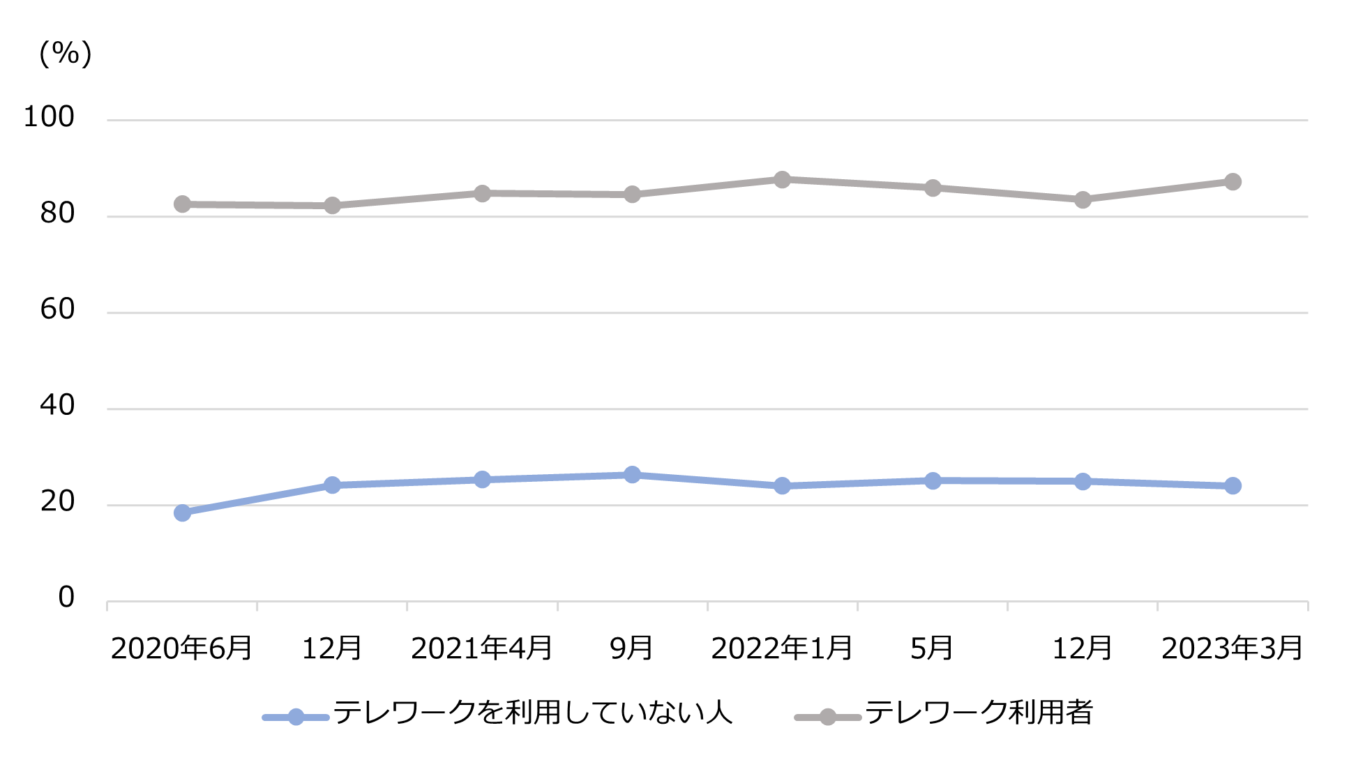 次に20206月時点と20233月時点の両時点でテレワークを利用していた人の仕事の効率性を比較する(図3-2)20206月から20233月にかけて、100と回答した人の割合が大きく増加し、6090と回答した人の割合が低下している。テレワークへの慣れや環境整備が進んだことで、テレワークの効率性が改善されたことが伺える。