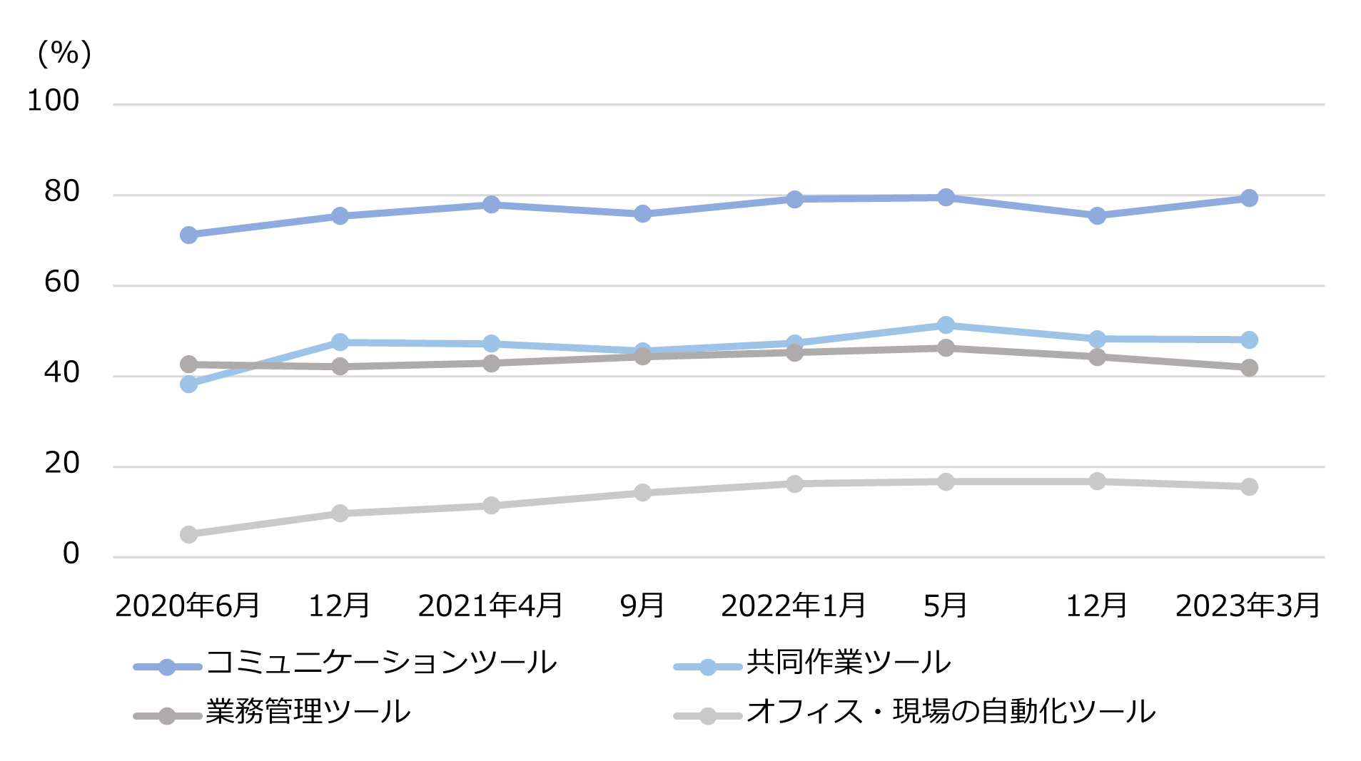 次にテレワーク利用者のICTツール利用率をツールの目的別にみると(図4-2)、コミュニケーションツールの利用率が最も高く、次に共同作業ツール、業務管理ツールが続いた。オフィス・現場の自動化ツールは、20206月時点はその利用率が5%と極めて低かったが、上昇傾向がみられる。