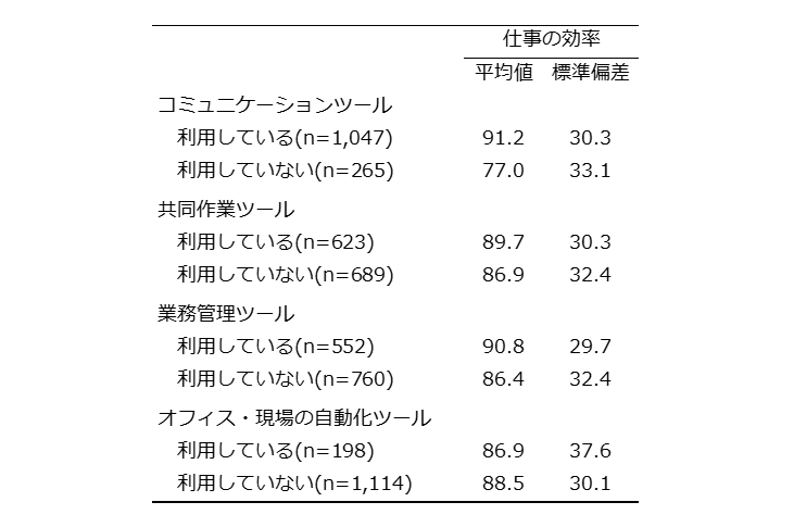 2023年3月時点の、テレワーク利用者のICTツールの利用の有無と仕事の効率(詳細は「3.仕事の効率の変化」を参照)の関係をみると(表4-3)、特にコミュニケーションツールの利用の有無によって、テレワーク利用者の仕事の効率の平均値が大きく異なることがわかる。