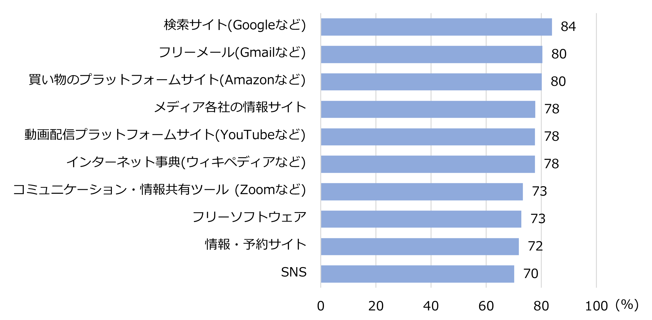 デジタルサービスの利用状況をみると(図5-1)、利用率の高いサービスとして、Googleなどの検索サイト(84%)Amazonなどの買い物プラットフォーム(80%)Gmailなどのフリーメール(80%)となった。他方、利用率が低いデジタルサービスとして、フリーソフトウェア、情報・予約サイト、SNSがあげられるが、いずれも70%を超えている。