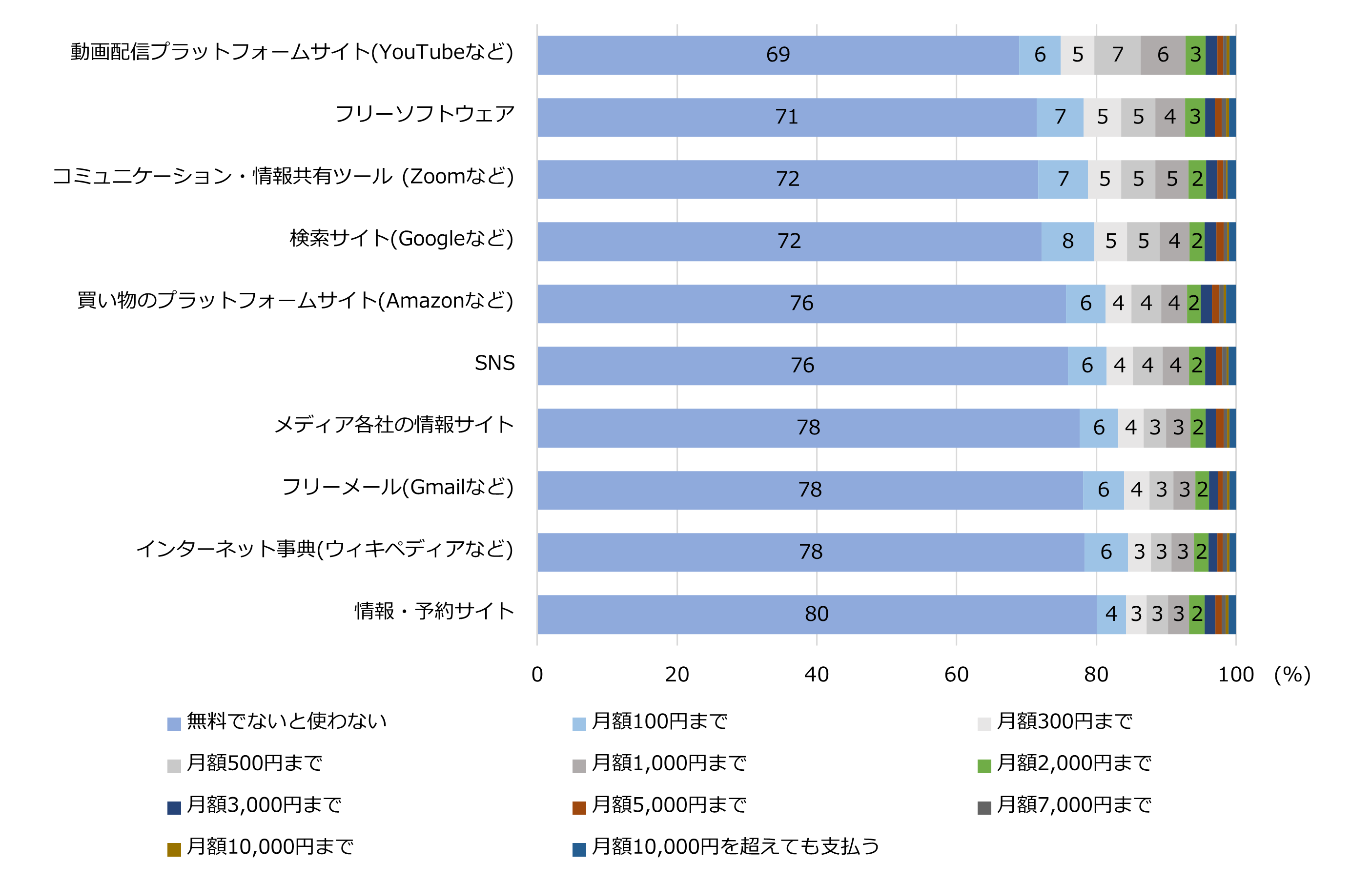 次にデジタルサービスの利用者における支払い意思額をみると(図5-2)、有料化になった場合、支払意思のない人(無料でないと利用しない人)は7080%程度となった。支払意思の割合が比較的高いデジタルサービスは、YouTubeなどの動画配信、ソフトウェア、Zoomなどのコミュニケーションツール、Googleなどの検索サイトであった。一方、支払い意思が低いデジタルサービスは、フリーメール、ニュース情報サイトであった。