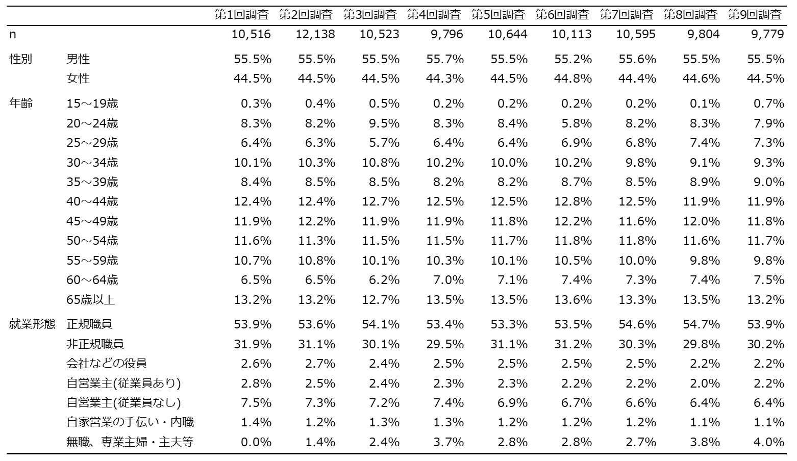 8 第1回調査では、全国の15歳以上の就業者を母集団とし、株式会社日経リサーチの提携モニターを対象にスクリーニング調査を実施し、就業者に該当する者のみが回答した。2019年度の総務省『労働力調査』の結果に基づき、性別、年齢(6区分)、地域(5区分)に応じて割り付け、回収目標数の10,000サンプルとなるよう調査を実施した。 8 第1回調査では、全国の15歳以上の就業者を母集団とし、株式会社日経リサーチの提携モニターを対象にスクリーニング調査を実施し、就業者に該当する者のみが回答した。2019年度の総務省『労働力調査』の結果に基づき、性別、年齢(6区分)、地域(5区分)に応じて割り付け、回収目標数の10,000サンプルとなるよう調査を実施した。