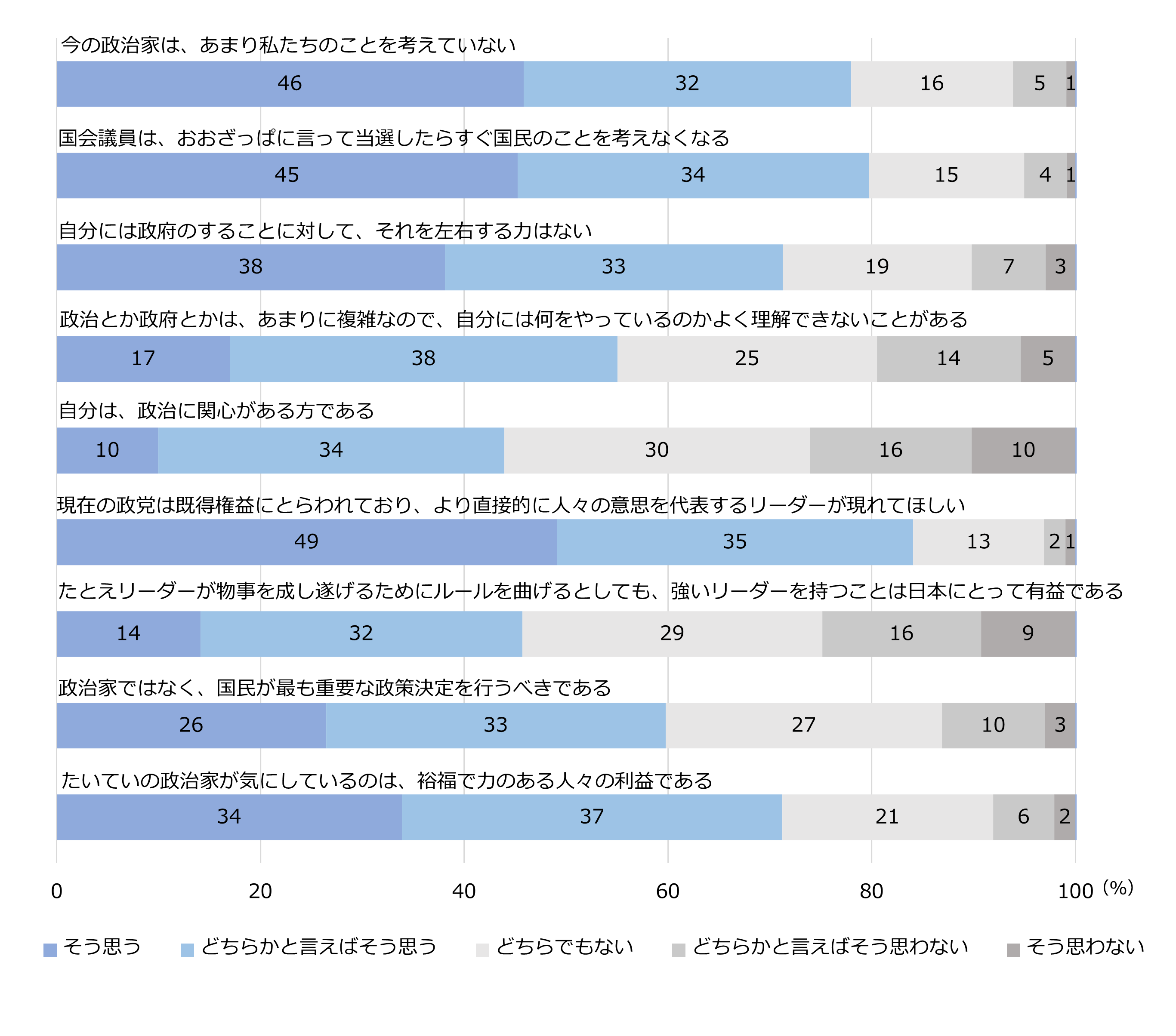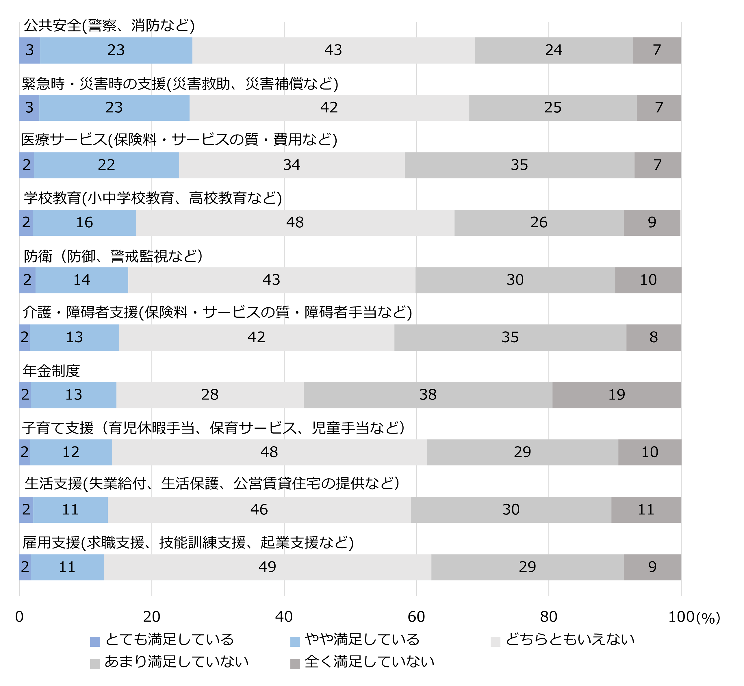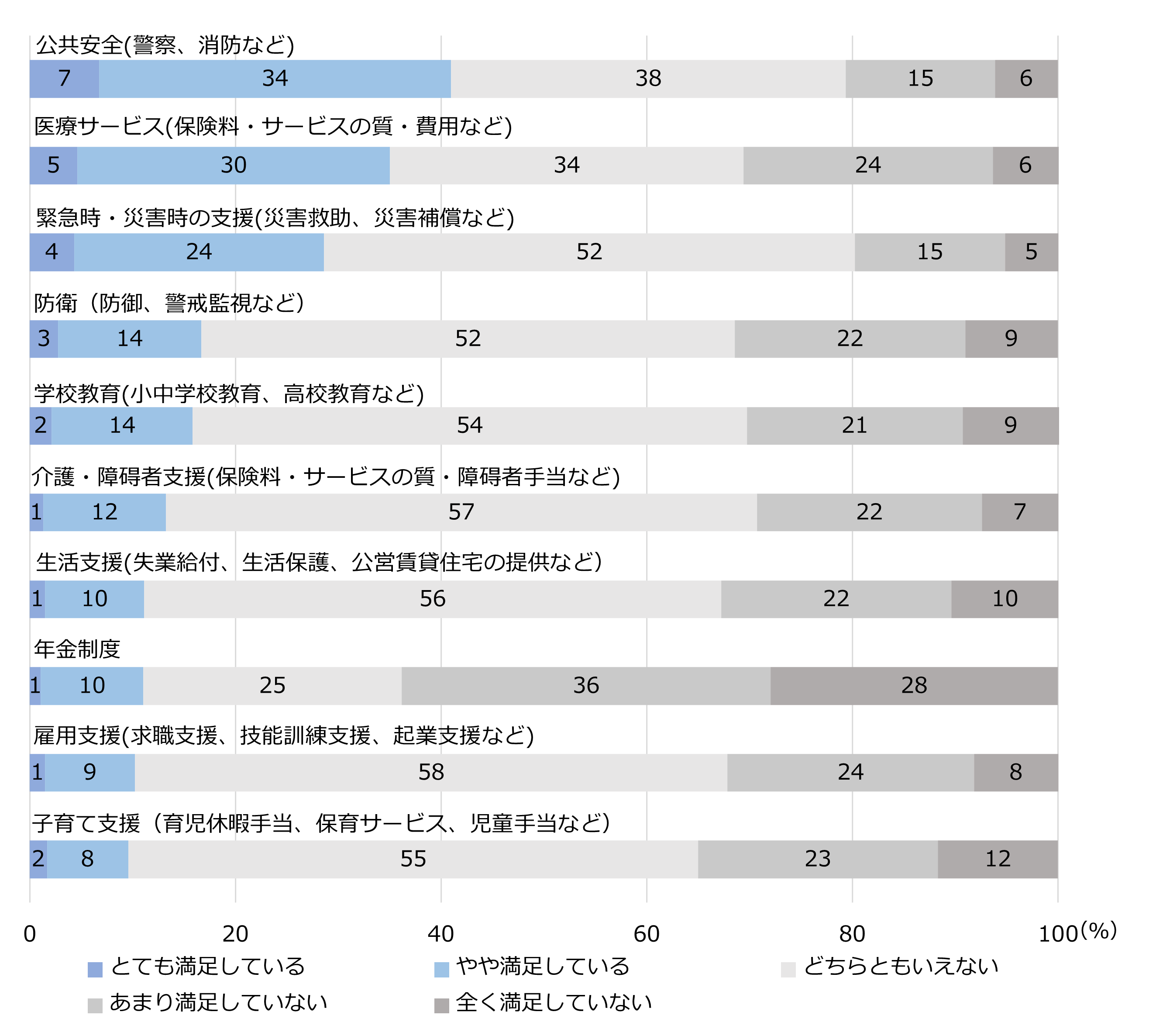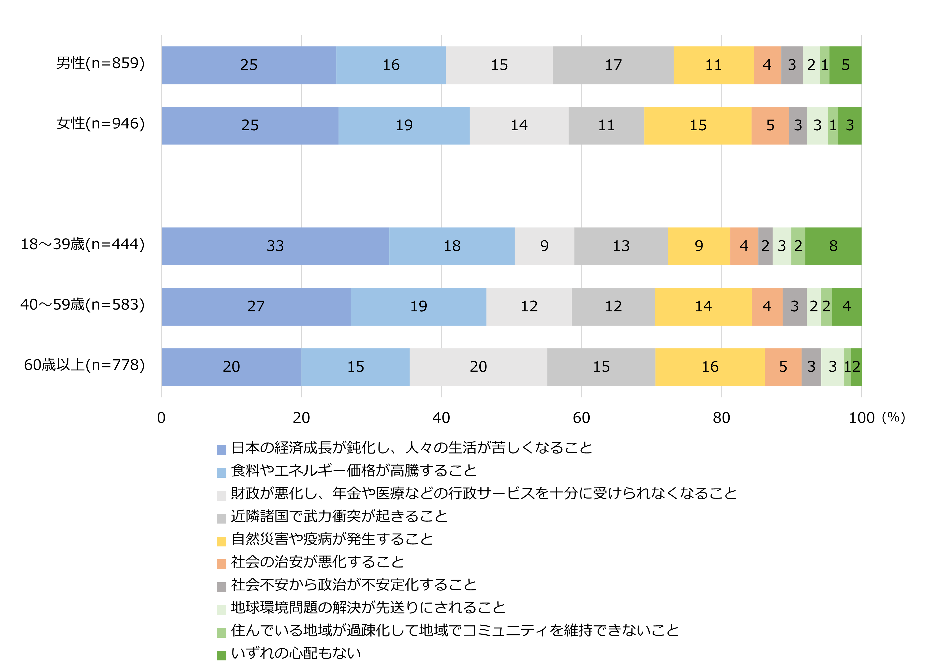 English version 研究報告書 2023.04.28 第1回政治・経済・社会に関する意識調査(NIRA基本調査)(速報) この記事は分で読めます シェア Tweet NIRA総合研究開発機構 最新の調査結果はこちら➡「第3回政治・経済・社会に関する意識調査」 概要 (公財)NIRA総合研究開発機構では、「第1回政治・経済・社会に関する意識調査(NIRA基本調査)」を実施した。本調査は政治・経済・社会に関連する人々の意識を定点観測することを目的としている。 調査は2023年3月16日(木)~2023年3月20日(月)にかけてオンラインで行われた。回収数は2,000件であり、うち有効回答数(トラップ設問をクリアした人)は1,805件だった(注1)。以下の速報結果は、トラップ設問をクリアした人のみを対象とし、「国勢調査(2020年)」の18歳以上の日本人を母集団とみなして、ウェイトによる補正を行った集計結果である(注2)。 速報を読む(2023年4月28日公表) (3.1MB) 調査票・単純集計結果を読む (1007.6KB) PDF (English) (229.1KB) INDEX Ⅰ 調査結果 1.政治分野 1.1. 長期的党派性と投票予定政党 1.2. 諸外国への親近感 1.3. 組織などへの信頼度と理由 1.4. 政治的有効性感覚・ポピュリズム態度 2.経済分野 2.1. 世帯の家計状況の変化 2.2. 世帯の家計状況、日本の経済状況の見通し 2.3. 個人の将来の心配事 2.4. 社会の将来の心配事 2.5. デジタル化や技術革新の影響に関する認識 2.6. 生活時間 2.7. 地域、ボランティア、副業、SDGs、グリーン・ジョブに関する活動状況 2.8. 環境に配慮した活動 3.社会分野 3.1. 社会に対する考え方 3.2. 公的サービスに対する考え方 3.3. 人々の社会意識 Ⅱ 調査概要 1.調査の趣旨・目的 2.調査名 3.主な調査項目 4.調査期間 5.調査方法 6.回収数 7.本報告書の集計方法 8.回答者の属性 9.研究体制 ポイント●組織などへの信頼に関して、「家族」、「自衛隊」、「裁判所」、「警察」、「お住まいの市町村」は70%以上の人が信頼している一方、「国会」、「政府」、「SNS(ツイッター・インスタグラムなど)」、「インターネットメディア(ニュースアプリ・サイトやブログなど)」は60%以上の人が信頼していないことがわかった。●「自分は、政治に関心がある方である」に肯定的な回答は50%を下回る一方、「現在の政党は既得権益にとらわれており、より直接的に人々の意思を代表するリーダーが現れてほしい」、「たいていの政治家が気にしているのは、裕福で力のある人々の利益である」に肯定的な回答は70%を上回った。●日本の経済状況の見通しについて、悲観視する人が多く、「暗い」または「どちらかといえば暗い」と回答した人は、近い将来(1~2年後)でも中長期的な将来(5~10年後)でも80%以上となった。●社会の将来の心配事として、近い将来でも中長期的な将来でも、「食料やエネルギー価格の高騰」、「経済成長の鈍化による生活苦」、「自然災害や疫病の発生」、「近隣諸国での武力衝突」、「財政悪化で行政サービスを受けられなくなること」をあげる人が多かった。●直近の「通常の1週間」の学習・自己啓発・訓練の時間はゼロの人の割合が最も高く、多くの人が自己研鑽に時間を投資できていないことがわかった。また、テレワーク利用者ほど自己研鑽の時間を確保できていることがわかった。●国債発行は抑制するべきと考える人の割合は、財政赤字を心配する必要はないと考える人の割合を上回った。また、「個人所得税を引き上げるときには、高所得者の税率を引き上げるべき」と考えている人の割合は60%を超えた。●「チャンスがあれば転職する方がよい」と回答した人の割合は、同じ企業に長く務める方がよい」と回答した人の割合を大きく上回った。特に若年層ほどこの傾向がみられた。●公的サービスの水準向上のための追加負担の意思を聞いたところ、64%の人が支払う意思があることがわかった。その項目として回答が多かったのは、「医療サービス」、「緊急時・災害時の支援」、「子育て支援」、「年金制度」だった。一方、回答が少なかったのは、「防衛」、「生活支援」であり、最も低いのは「雇用支援」だった。●国や自治体の支出について、現在のサービス水準を維持したまま、無駄をなくすことで最も支出を減らせると考えられている費用は「行政の人件費」であった。また、どの費用も1~2割程度無駄があると考えている人が最も多かった。 図表図1-1-1 長期的党派性図1-1-2 年齢階層別にみた長期的党派性図1-1-3 投票傾向―長期的党派性と今後の比較-図1-2 諸外国への親近感図1-3 組織などへの信頼度図1-4-1 政治的有効性感覚・ポピュリズム態度図1-4-2 年齢階層別・投票別にみた政治的疎外意識図2-1-1 世帯の家計状況の変化図2-1-2 男女別、年齢階層別にみた世帯の家計状況の変化(新型コロナウイルスの感染拡大前との比較)図2-1-3 世帯所得別にみた世帯の家計状況の変化(新型コロナウイルスの感染拡大前との比較)図2-2-1 世帯の家計状況の見通し図2-2-2 日本の経済状況の見通し図2-2-3 男女別、年齢階層別にみた中長期(5~10年後)の日本の経済状況の見通し図2-2-