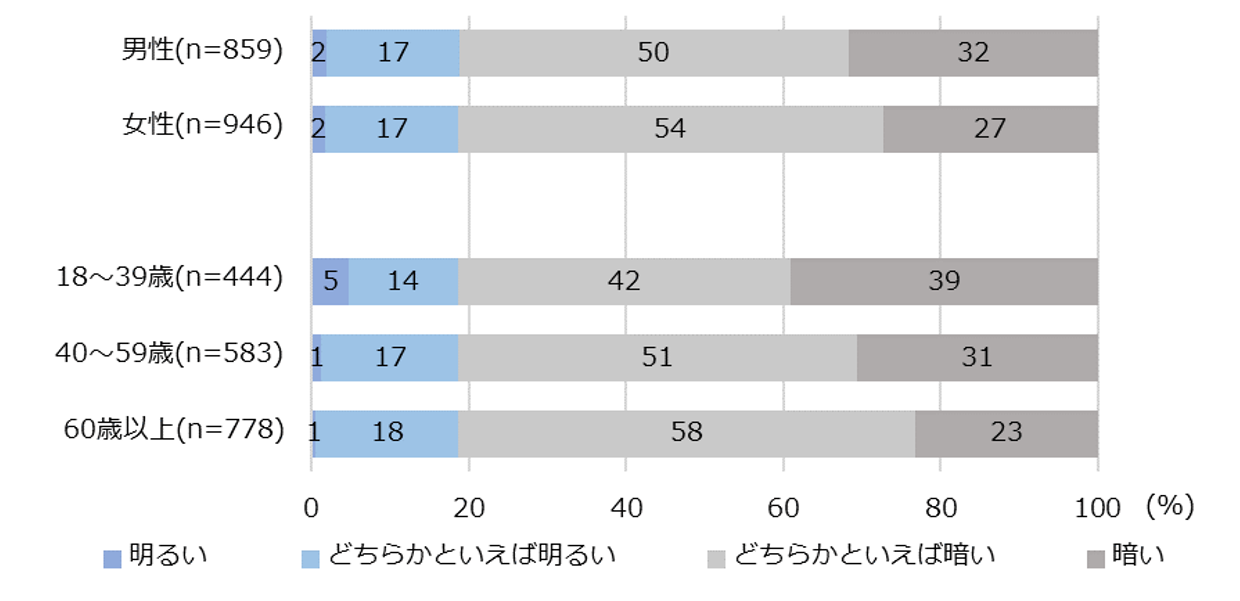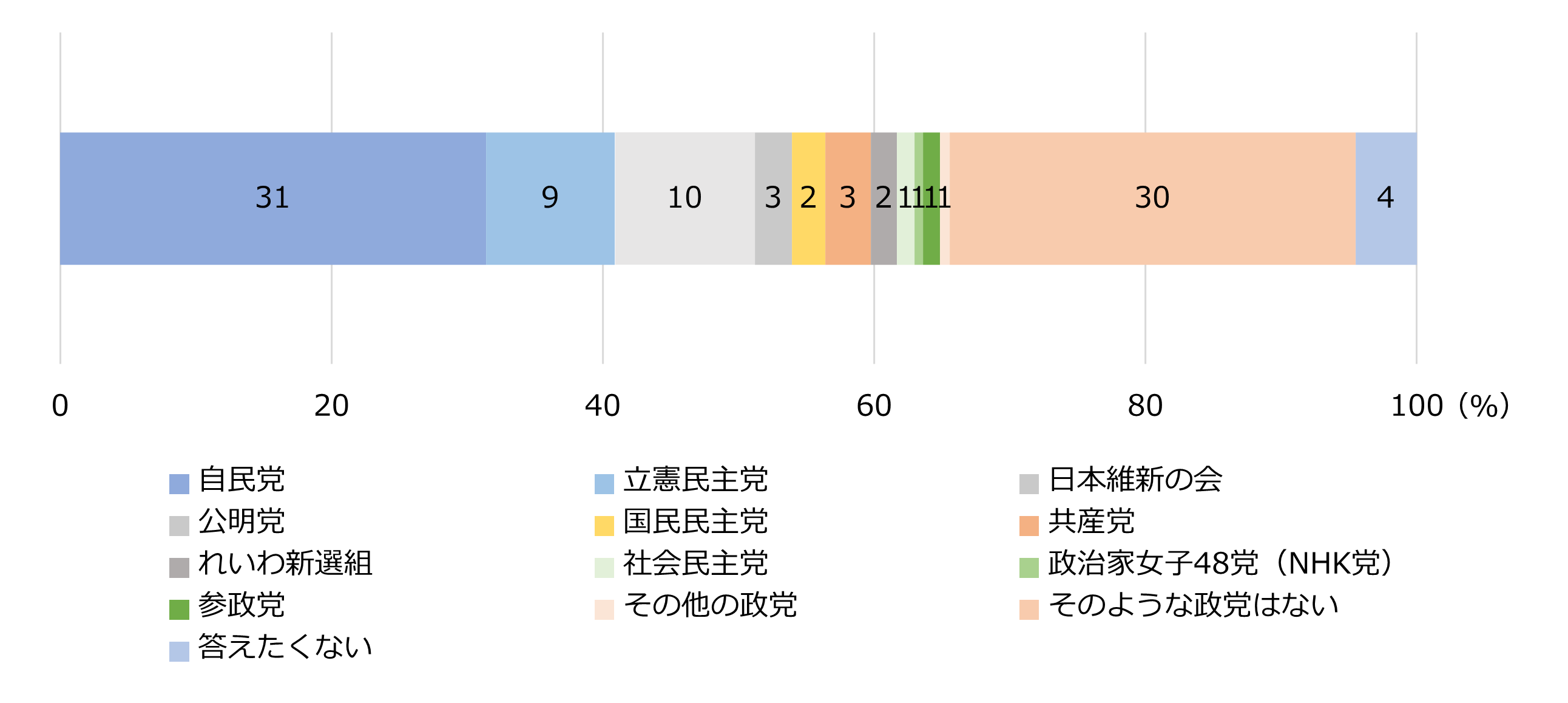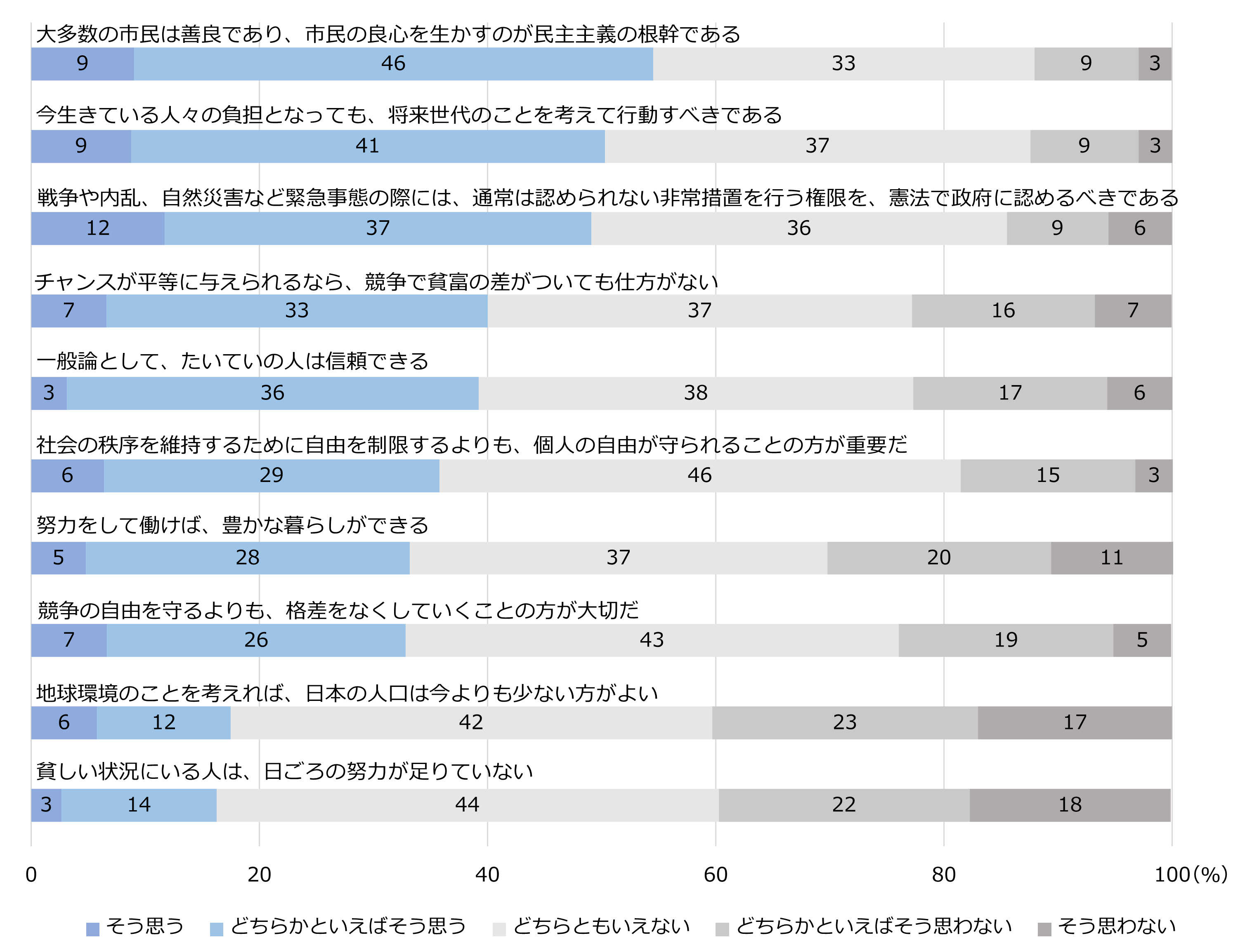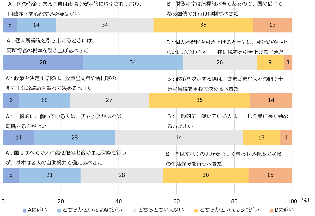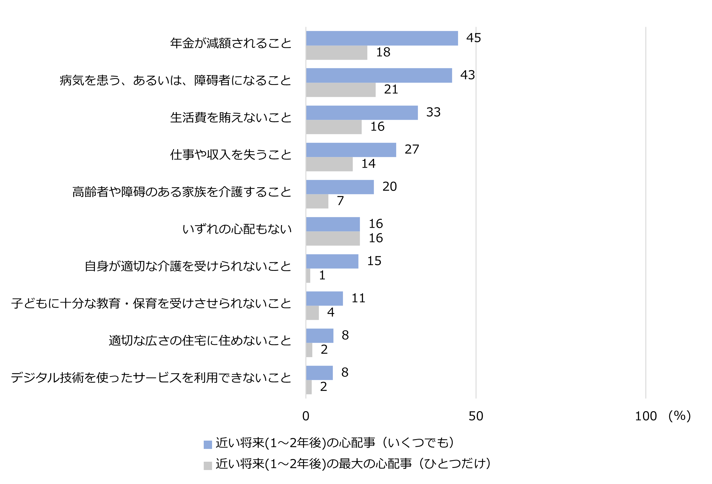 English version 研究報告書 2023.04.28 第1回政治・経済・社会に関する意識調査(NIRA基本調査)(速報) この記事は分で読めます シェア Tweet NIRA総合研究開発機構 最新の調査結果はこちら➡「第3回政治・経済・社会に関する意識調査」 概要 (公財)NIRA総合研究開発機構では、「第1回政治・経済・社会に関する意識調査(NIRA基本調査)」を実施した。本調査は政治・経済・社会に関連する人々の意識を定点観測することを目的としている。 調査は2023年3月16日(木)~2023年3月20日(月)にかけてオンラインで行われた。回収数は2,000件であり、うち有効回答数(トラップ設問をクリアした人)は1,805件だった(注1)。以下の速報結果は、トラップ設問をクリアした人のみを対象とし、「国勢調査(2020年)」の18歳以上の日本人を母集団とみなして、ウェイトによる補正を行った集計結果である(注2)。 速報を読む(2023年4月28日公表) (3.1MB) 調査票・単純集計結果を読む (1007.6KB) PDF (English) (229.1KB) INDEX Ⅰ 調査結果 1.政治分野 1.1. 長期的党派性と投票予定政党 1.2. 諸外国への親近感 1.3. 組織などへの信頼度と理由 1.4. 政治的有効性感覚・ポピュリズム態度 2.経済分野 2.1. 世帯の家計状況の変化 2.2. 世帯の家計状況、日本の経済状況の見通し 2.3. 個人の将来の心配事 2.4. 社会の将来の心配事 2.5. デジタル化や技術革新の影響に関する認識 2.6. 生活時間 2.7. 地域、ボランティア、副業、SDGs、グリーン・ジョブに関する活動状況 2.8. 環境に配慮した活動 3.社会分野 3.1. 社会に対する考え方 3.2. 公的サービスに対する考え方 3.3. 人々の社会意識 Ⅱ 調査概要 1.調査の趣旨・目的 2.調査名 3.主な調査項目 4.調査期間 5.調査方法 6.回収数 7.本報告書の集計方法 8.回答者の属性 9.研究体制 ポイント●組織などへの信頼に関して、「家族」、「自衛隊」、「裁判所」、「警察」、「お住まいの市町村」は70%以上の人が信頼している一方、「国会」、「政府」、「SNS(ツイッター・インスタグラムなど)」、「インターネットメディア(ニュースアプリ・サイトやブログなど)」は60%以上の人が信頼していないことがわかった。●「自分は、政治に関心がある方である」に肯定的な回答は50%を下回る一方、「現在の政党は既得権益にとらわれており、より直接的に人々の意思を代表するリーダーが現れてほしい」、「たいていの政治家が気にしているのは、裕福で力のある人々の利益である」に肯定的な回答は70%を上回った。●日本の経済状況の見通しについて、悲観視する人が多く、「暗い」または「どちらかといえば暗い」と回答した人は、近い将来(1~2年後)でも中長期的な将来(5~10年後)でも80%以上となった。●社会の将来の心配事として、近い将来でも中長期的な将来でも、「食料やエネルギー価格の高騰」、「経済成長の鈍化による生活苦」、「自然災害や疫病の発生」、「近隣諸国での武力衝突」、「財政悪化で行政サービスを受けられなくなること」をあげる人が多かった。●直近の「通常の1週間」の学習・自己啓発・訓練の時間はゼロの人の割合が最も高く、多くの人が自己研鑽に時間を投資できていないことがわかった。また、テレワーク利用者ほど自己研鑽の時間を確保できていることがわかった。●国債発行は抑制するべきと考える人の割合は、財政赤字を心配する必要はないと考える人の割合を上回った。また、「個人所得税を引き上げるときには、高所得者の税率を引き上げるべき」と考えている人の割合は60%を超えた。●「チャンスがあれば転職する方がよい」と回答した人の割合は、同じ企業に長く務める方がよい」と回答した人の割合を大きく上回った。特に若年層ほどこの傾向がみられた。●公的サービスの水準向上のための追加負担の意思を聞いたところ、64%の人が支払う意思があることがわかった。その項目として回答が多かったのは、「医療サービス」、「緊急時・災害時の支援」、「子育て支援」、「年金制度」だった。一方、回答が少なかったのは、「防衛」、「生活支援」であり、最も低いのは「雇用支援」だった。●国や自治体の支出について、現在のサービス水準を維持したまま、無駄をなくすことで最も支出を減らせると考えられている費用は「行政の人件費」であった。また、どの費用も1~2割程度無駄があると考えている人が最も多かった。 図表図1-1-1 長期的党派性図1-1-2 年齢階層別にみた長期的党派性図1-1-3 投票傾向―長期的党派性と今後の比較-図1-2 諸外国への親近感図1-3 組織などへの信頼度図1-4-1 政治的有効性感覚・ポピュリズム態度図1-4-2 年齢階層別・投票別にみた政治的疎外意識図2-1-1 世帯の家計状況の変化図2-1-2 男女別、年齢階層別にみた世帯の家計状況の変化(新型コロナウイルスの感染拡大前との比較)図2-1-3 世帯所得別にみた世帯の家計状況の変化(新型コロナウイルスの感染拡大前との比較)図2-2-1 世帯の家計状況の見通し図2-2-2 日本の経済状況の見通し図2-2-3 男女別、年齢階層別にみた中長期(5~10年後)の日本の経済状況の見通し図2-2-