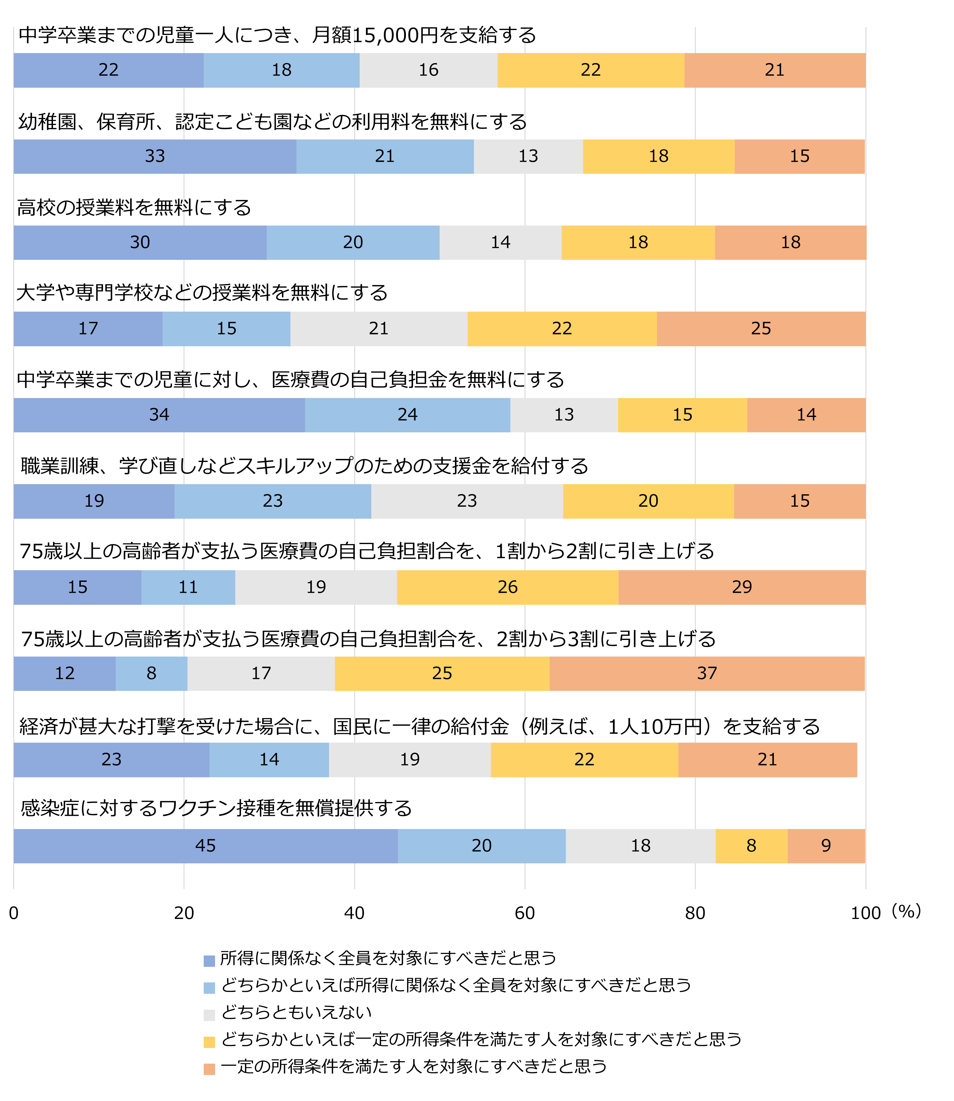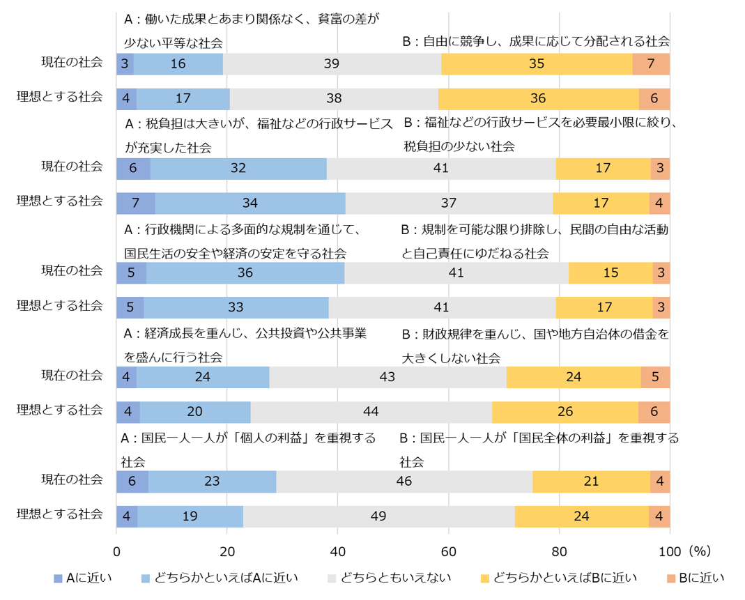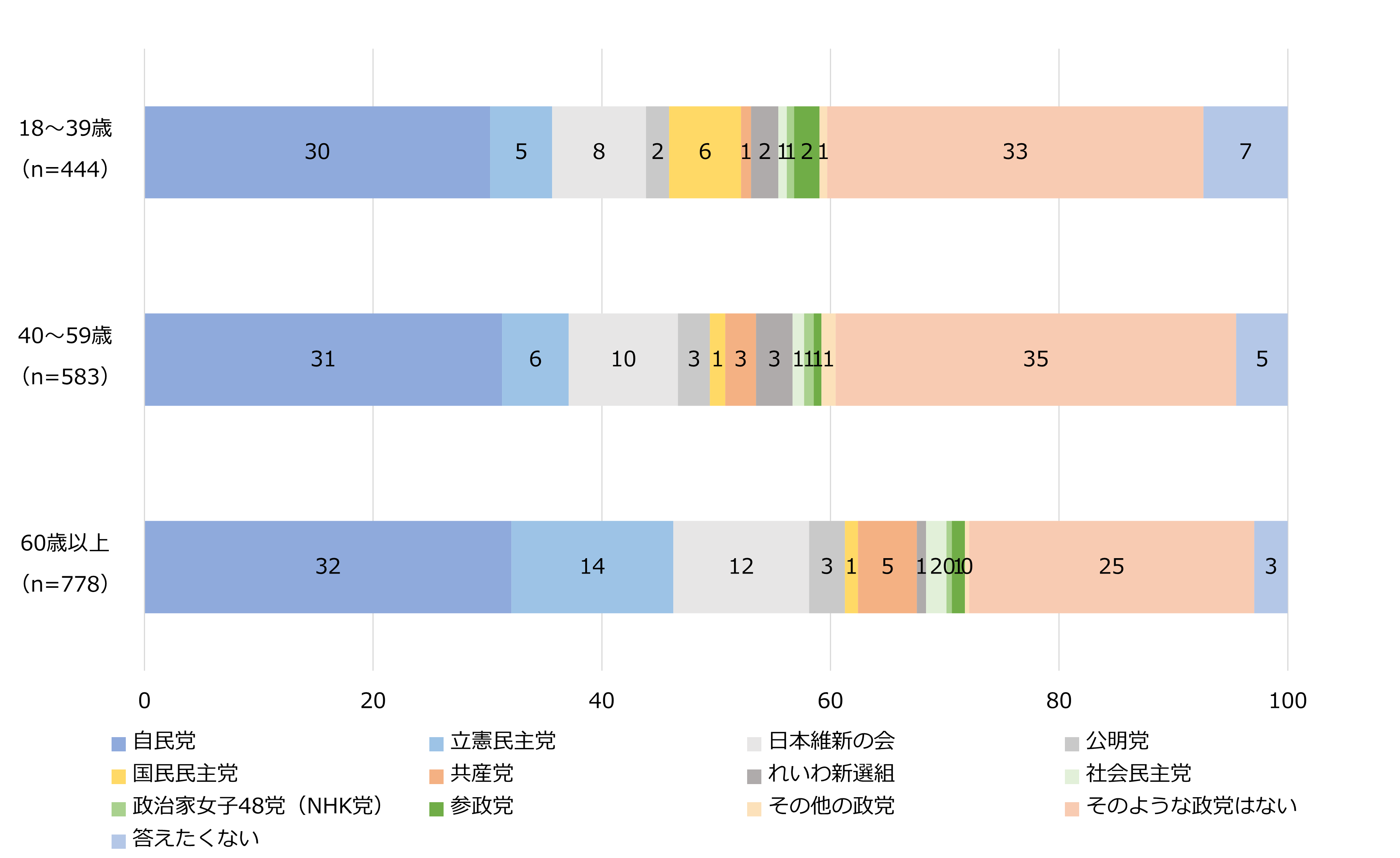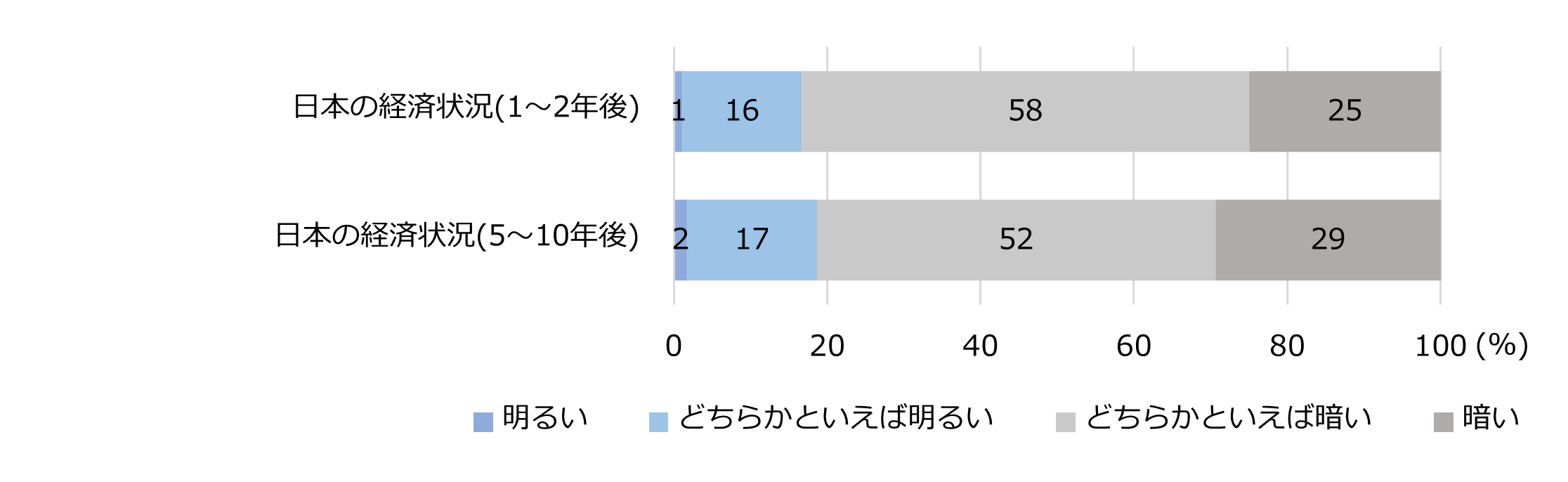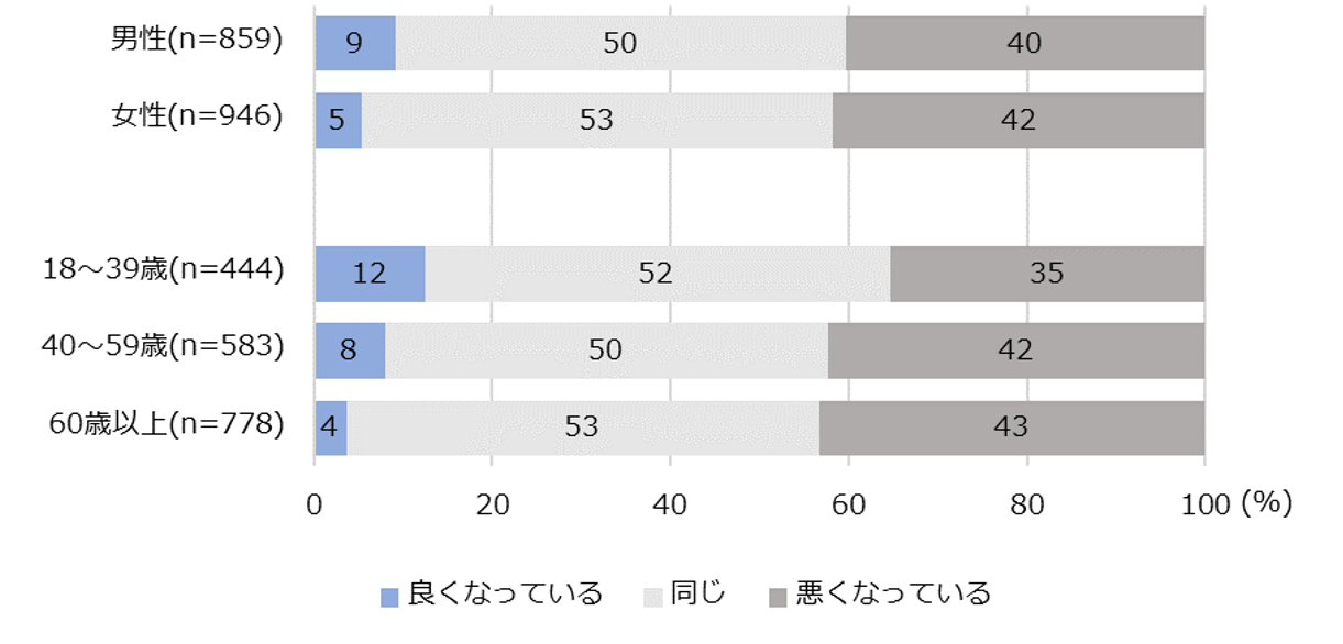 English version 研究報告書 2023.04.28 第1回政治・経済・社会に関する意識調査(NIRA基本調査)(速報) この記事は分で読めます シェア Tweet NIRA総合研究開発機構 最新の調査結果はこちら➡「第3回政治・経済・社会に関する意識調査」 概要 (公財)NIRA総合研究開発機構では、「第1回政治・経済・社会に関する意識調査(NIRA基本調査)」を実施した。本調査は政治・経済・社会に関連する人々の意識を定点観測することを目的としている。 調査は2023年3月16日(木)~2023年3月20日(月)にかけてオンラインで行われた。回収数は2,000件であり、うち有効回答数(トラップ設問をクリアした人)は1,805件だった(注1)。以下の速報結果は、トラップ設問をクリアした人のみを対象とし、「国勢調査(2020年)」の18歳以上の日本人を母集団とみなして、ウェイトによる補正を行った集計結果である(注2)。 速報を読む(2023年4月28日公表) (3.1MB) 調査票・単純集計結果を読む (1007.6KB) PDF (English) (229.1KB) INDEX Ⅰ 調査結果 1.政治分野 1.1. 長期的党派性と投票予定政党 1.2. 諸外国への親近感 1.3. 組織などへの信頼度と理由 1.4. 政治的有効性感覚・ポピュリズム態度 2.経済分野 2.1. 世帯の家計状況の変化 2.2. 世帯の家計状況、日本の経済状況の見通し 2.3. 個人の将来の心配事 2.4. 社会の将来の心配事 2.5. デジタル化や技術革新の影響に関する認識 2.6. 生活時間 2.7. 地域、ボランティア、副業、SDGs、グリーン・ジョブに関する活動状況 2.8. 環境に配慮した活動 3.社会分野 3.1. 社会に対する考え方 3.2. 公的サービスに対する考え方 3.3. 人々の社会意識 Ⅱ 調査概要 1.調査の趣旨・目的 2.調査名 3.主な調査項目 4.調査期間 5.調査方法 6.回収数 7.本報告書の集計方法 8.回答者の属性 9.研究体制 ポイント●組織などへの信頼に関して、「家族」、「自衛隊」、「裁判所」、「警察」、「お住まいの市町村」は70%以上の人が信頼している一方、「国会」、「政府」、「SNS(ツイッター・インスタグラムなど)」、「インターネットメディア(ニュースアプリ・サイトやブログなど)」は60%以上の人が信頼していないことがわかった。●「自分は、政治に関心がある方である」に肯定的な回答は50%を下回る一方、「現在の政党は既得権益にとらわれており、より直接的に人々の意思を代表するリーダーが現れてほしい」、「たいていの政治家が気にしているのは、裕福で力のある人々の利益である」に肯定的な回答は70%を上回った。●日本の経済状況の見通しについて、悲観視する人が多く、「暗い」または「どちらかといえば暗い」と回答した人は、近い将来(1~2年後)でも中長期的な将来(5~10年後)でも80%以上となった。●社会の将来の心配事として、近い将来でも中長期的な将来でも、「食料やエネルギー価格の高騰」、「経済成長の鈍化による生活苦」、「自然災害や疫病の発生」、「近隣諸国での武力衝突」、「財政悪化で行政サービスを受けられなくなること」をあげる人が多かった。●直近の「通常の1週間」の学習・自己啓発・訓練の時間はゼロの人の割合が最も高く、多くの人が自己研鑽に時間を投資できていないことがわかった。また、テレワーク利用者ほど自己研鑽の時間を確保できていることがわかった。●国債発行は抑制するべきと考える人の割合は、財政赤字を心配する必要はないと考える人の割合を上回った。また、「個人所得税を引き上げるときには、高所得者の税率を引き上げるべき」と考えている人の割合は60%を超えた。●「チャンスがあれば転職する方がよい」と回答した人の割合は、同じ企業に長く務める方がよい」と回答した人の割合を大きく上回った。特に若年層ほどこの傾向がみられた。●公的サービスの水準向上のための追加負担の意思を聞いたところ、64%の人が支払う意思があることがわかった。その項目として回答が多かったのは、「医療サービス」、「緊急時・災害時の支援」、「子育て支援」、「年金制度」だった。一方、回答が少なかったのは、「防衛」、「生活支援」であり、最も低いのは「雇用支援」だった。●国や自治体の支出について、現在のサービス水準を維持したまま、無駄をなくすことで最も支出を減らせると考えられている費用は「行政の人件費」であった。また、どの費用も1~2割程度無駄があると考えている人が最も多かった。 図表図1-1-1 長期的党派性図1-1-2 年齢階層別にみた長期的党派性図1-1-3 投票傾向―長期的党派性と今後の比較-図1-2 諸外国への親近感図1-3 組織などへの信頼度図1-4-1 政治的有効性感覚・ポピュリズム態度図1-4-2 年齢階層別・投票別にみた政治的疎外意識図2-1-1 世帯の家計状況の変化図2-1-2 男女別、年齢階層別にみた世帯の家計状況の変化(新型コロナウイルスの感染拡大前との比較)図2-1-3 世帯所得別にみた世帯の家計状況の変化(新型コロナウイルスの感染拡大前との比較)図2-2-1 世帯の家計状況の見通し図2-2-2 日本の経済状況の見通し図2-2-3 男女別、年齢階層別にみた中長期(5~10年後)の日本の経済状況の見通し図2-2-