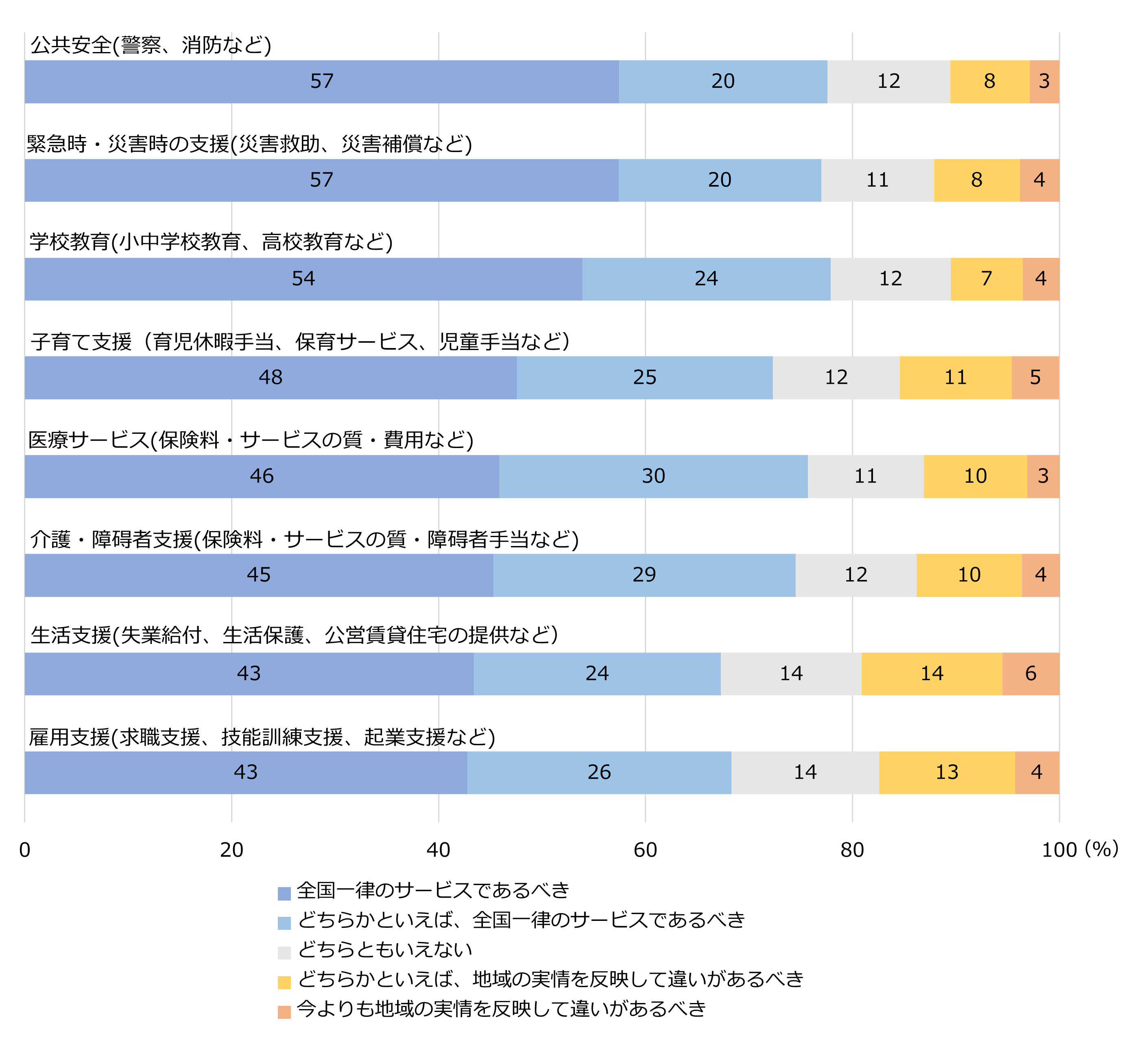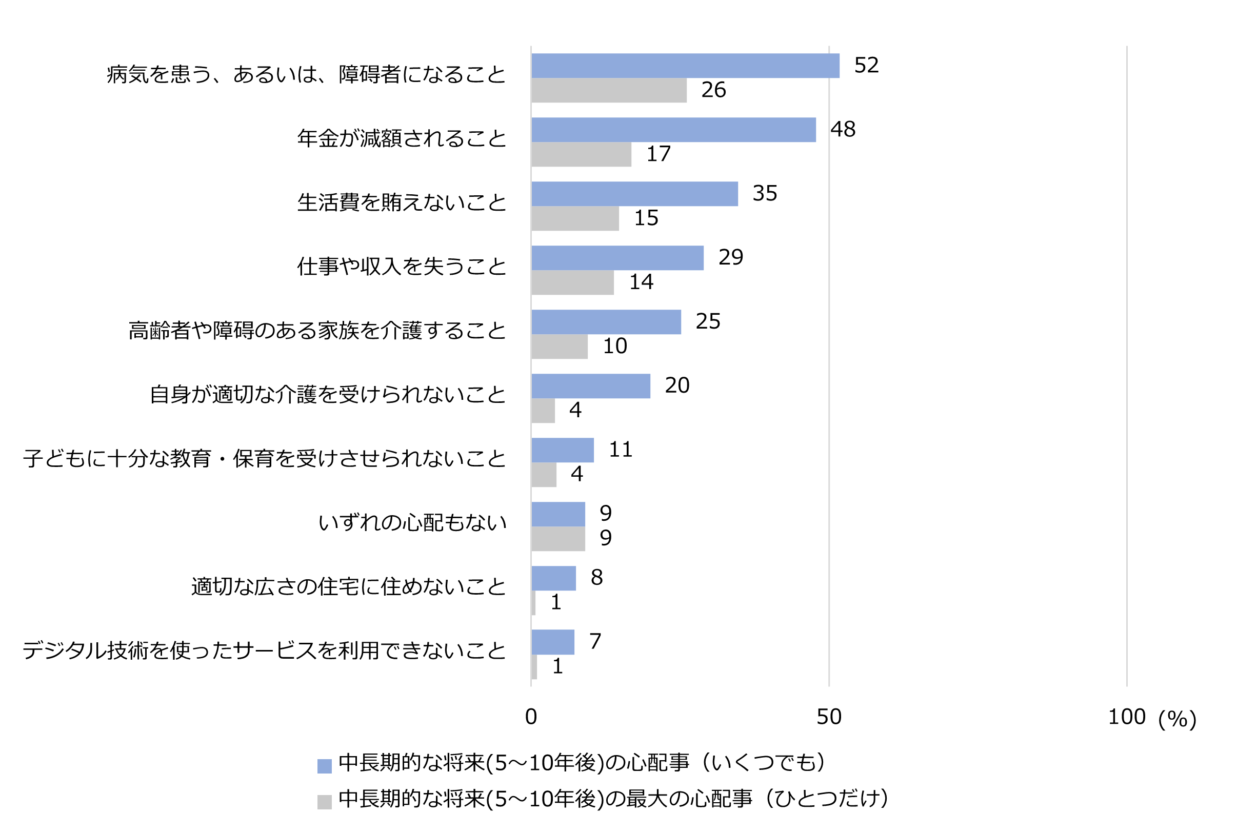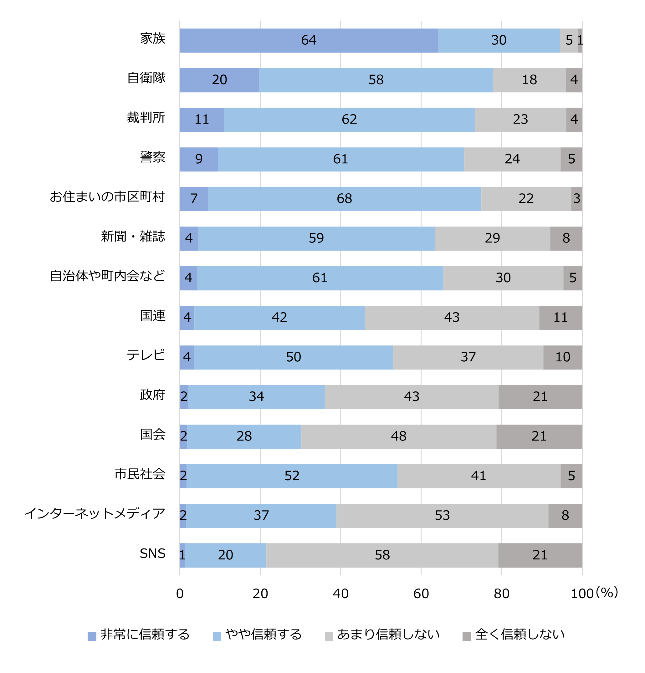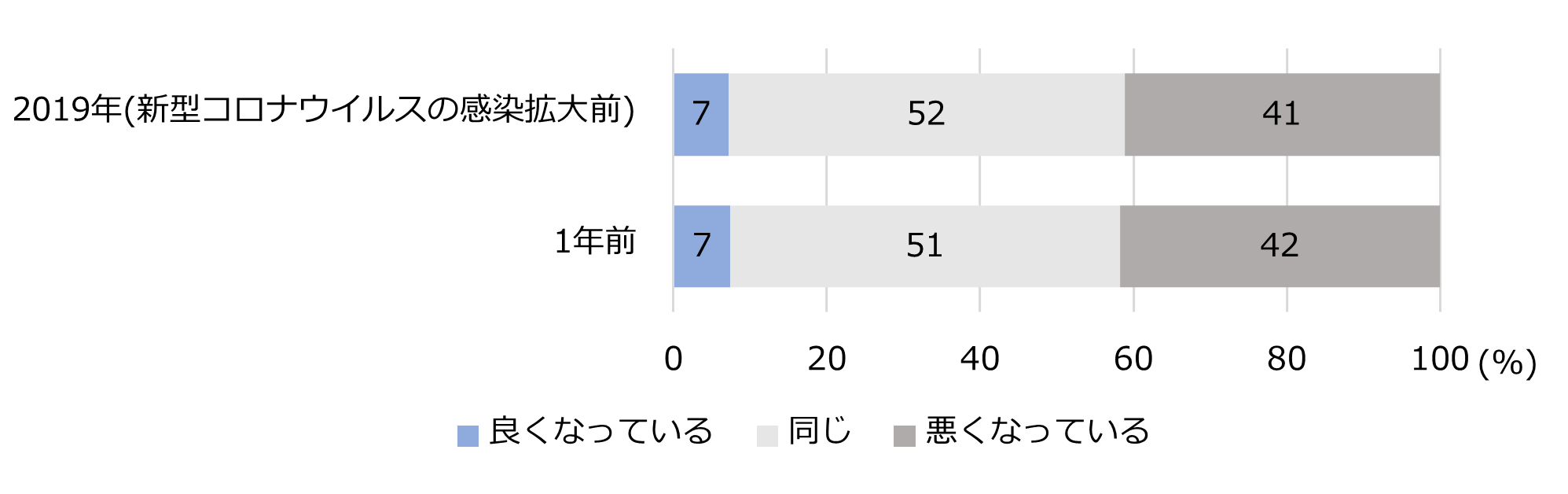 English version 研究報告書 2023.04.28 第1回政治・経済・社会に関する意識調査(NIRA基本調査)(速報) この記事は分で読めます シェア Tweet NIRA総合研究開発機構 最新の調査結果はこちら➡「第3回政治・経済・社会に関する意識調査」 概要 (公財)NIRA総合研究開発機構では、「第1回政治・経済・社会に関する意識調査(NIRA基本調査)」を実施した。本調査は政治・経済・社会に関連する人々の意識を定点観測することを目的としている。 調査は2023年3月16日(木)~2023年3月20日(月)にかけてオンラインで行われた。回収数は2,000件であり、うち有効回答数(トラップ設問をクリアした人)は1,805件だった(注1)。以下の速報結果は、トラップ設問をクリアした人のみを対象とし、「国勢調査(2020年)」の18歳以上の日本人を母集団とみなして、ウェイトによる補正を行った集計結果である(注2)。 速報を読む(2023年4月28日公表) (3.1MB) 調査票・単純集計結果を読む (1007.6KB) PDF (English) (229.1KB) INDEX Ⅰ 調査結果 1.政治分野 1.1. 長期的党派性と投票予定政党 1.2. 諸外国への親近感 1.3. 組織などへの信頼度と理由 1.4. 政治的有効性感覚・ポピュリズム態度 2.経済分野 2.1. 世帯の家計状況の変化 2.2. 世帯の家計状況、日本の経済状況の見通し 2.3. 個人の将来の心配事 2.4. 社会の将来の心配事 2.5. デジタル化や技術革新の影響に関する認識 2.6. 生活時間 2.7. 地域、ボランティア、副業、SDGs、グリーン・ジョブに関する活動状況 2.8. 環境に配慮した活動 3.社会分野 3.1. 社会に対する考え方 3.2. 公的サービスに対する考え方 3.3. 人々の社会意識 Ⅱ 調査概要 1.調査の趣旨・目的 2.調査名 3.主な調査項目 4.調査期間 5.調査方法 6.回収数 7.本報告書の集計方法 8.回答者の属性 9.研究体制 ポイント●組織などへの信頼に関して、「家族」、「自衛隊」、「裁判所」、「警察」、「お住まいの市町村」は70%以上の人が信頼している一方、「国会」、「政府」、「SNS(ツイッター・インスタグラムなど)」、「インターネットメディア(ニュースアプリ・サイトやブログなど)」は60%以上の人が信頼していないことがわかった。●「自分は、政治に関心がある方である」に肯定的な回答は50%を下回る一方、「現在の政党は既得権益にとらわれており、より直接的に人々の意思を代表するリーダーが現れてほしい」、「たいていの政治家が気にしているのは、裕福で力のある人々の利益である」に肯定的な回答は70%を上回った。●日本の経済状況の見通しについて、悲観視する人が多く、「暗い」または「どちらかといえば暗い」と回答した人は、近い将来(1~2年後)でも中長期的な将来(5~10年後)でも80%以上となった。●社会の将来の心配事として、近い将来でも中長期的な将来でも、「食料やエネルギー価格の高騰」、「経済成長の鈍化による生活苦」、「自然災害や疫病の発生」、「近隣諸国での武力衝突」、「財政悪化で行政サービスを受けられなくなること」をあげる人が多かった。●直近の「通常の1週間」の学習・自己啓発・訓練の時間はゼロの人の割合が最も高く、多くの人が自己研鑽に時間を投資できていないことがわかった。また、テレワーク利用者ほど自己研鑽の時間を確保できていることがわかった。●国債発行は抑制するべきと考える人の割合は、財政赤字を心配する必要はないと考える人の割合を上回った。また、「個人所得税を引き上げるときには、高所得者の税率を引き上げるべき」と考えている人の割合は60%を超えた。●「チャンスがあれば転職する方がよい」と回答した人の割合は、同じ企業に長く務める方がよい」と回答した人の割合を大きく上回った。特に若年層ほどこの傾向がみられた。●公的サービスの水準向上のための追加負担の意思を聞いたところ、64%の人が支払う意思があることがわかった。その項目として回答が多かったのは、「医療サービス」、「緊急時・災害時の支援」、「子育て支援」、「年金制度」だった。一方、回答が少なかったのは、「防衛」、「生活支援」であり、最も低いのは「雇用支援」だった。●国や自治体の支出について、現在のサービス水準を維持したまま、無駄をなくすことで最も支出を減らせると考えられている費用は「行政の人件費」であった。また、どの費用も1~2割程度無駄があると考えている人が最も多かった。 図表図1-1-1 長期的党派性図1-1-2 年齢階層別にみた長期的党派性図1-1-3 投票傾向―長期的党派性と今後の比較-図1-2 諸外国への親近感図1-3 組織などへの信頼度図1-4-1 政治的有効性感覚・ポピュリズム態度図1-4-2 年齢階層別・投票別にみた政治的疎外意識図2-1-1 世帯の家計状況の変化図2-1-2 男女別、年齢階層別にみた世帯の家計状況の変化(新型コロナウイルスの感染拡大前との比較)図2-1-3 世帯所得別にみた世帯の家計状況の変化(新型コロナウイルスの感染拡大前との比較)図2-2-1 世帯の家計状況の見通し図2-2-2 日本の経済状況の見通し図2-2-3 男女別、年齢階層別にみた中長期(5~10年後)の日本の経済状況の見通し図2-2-