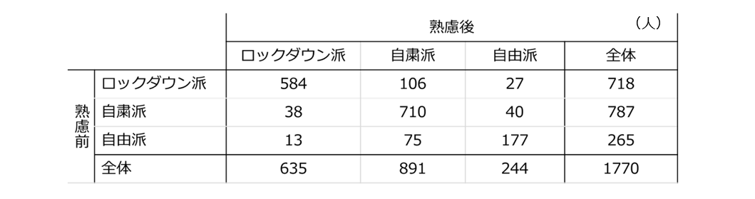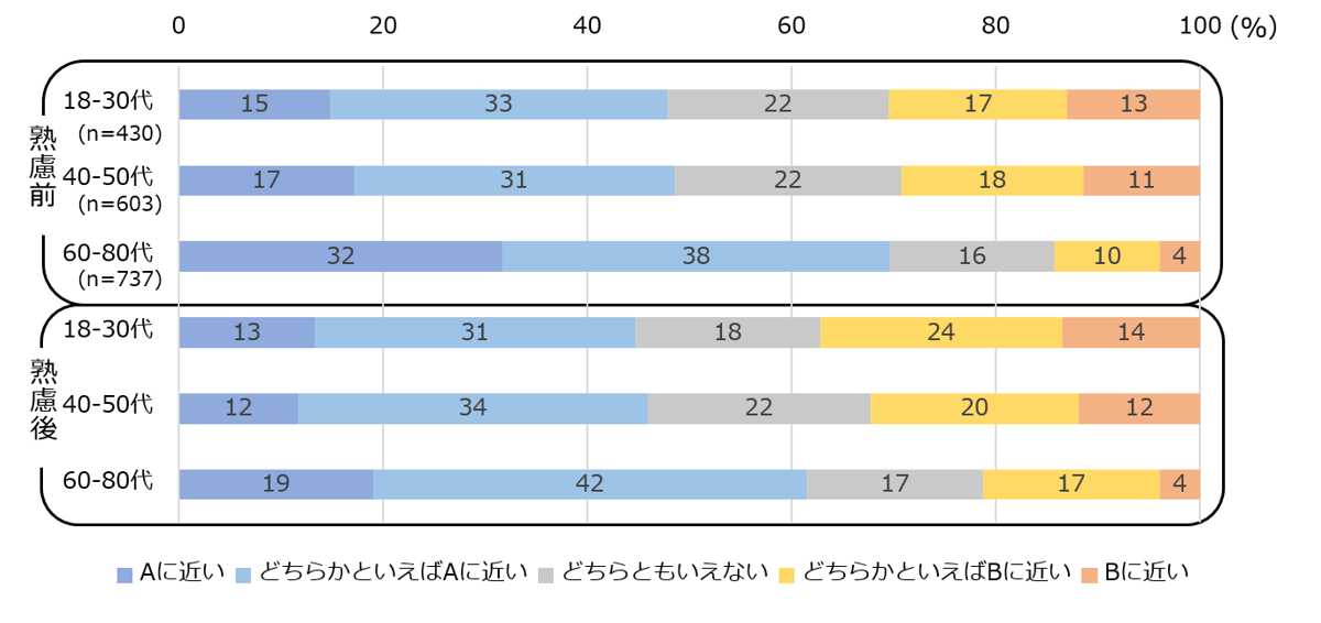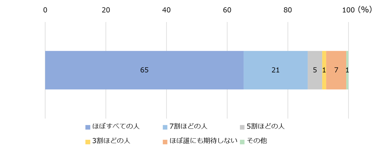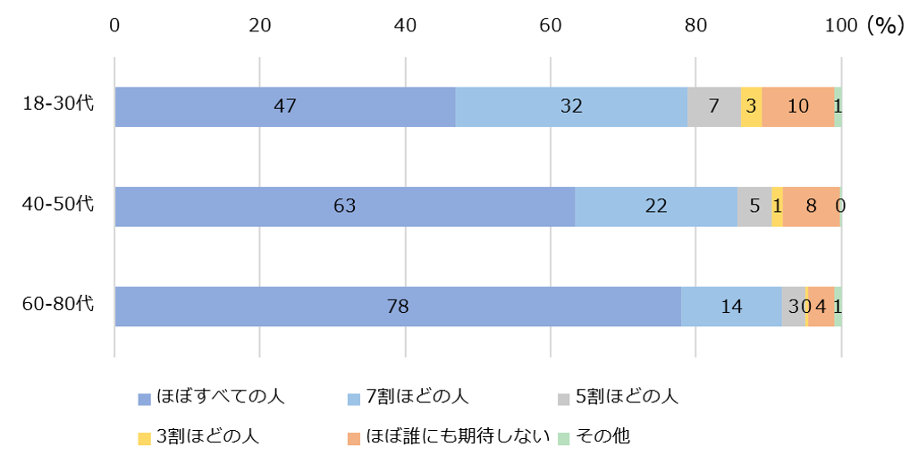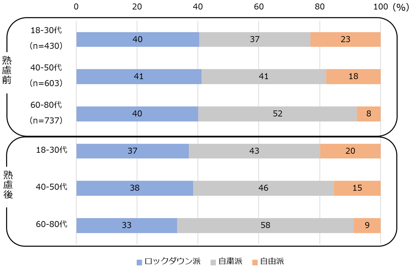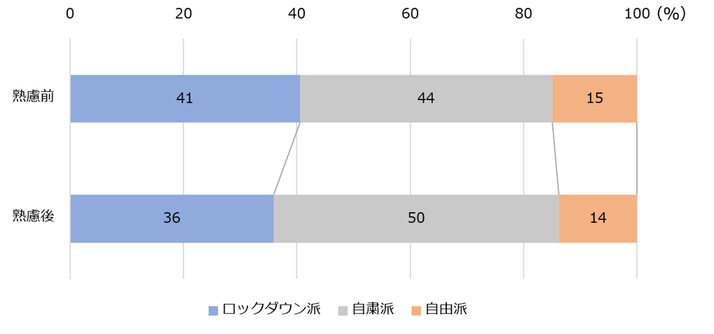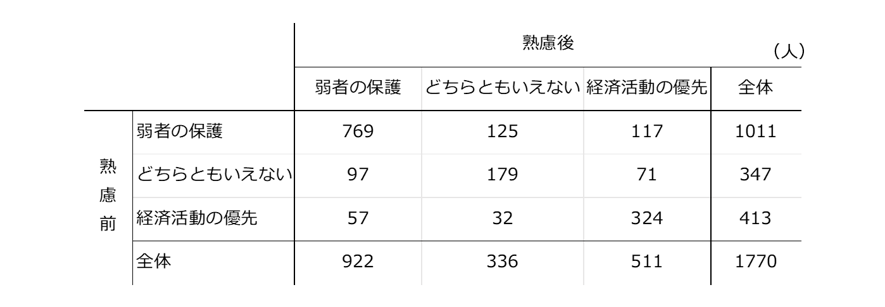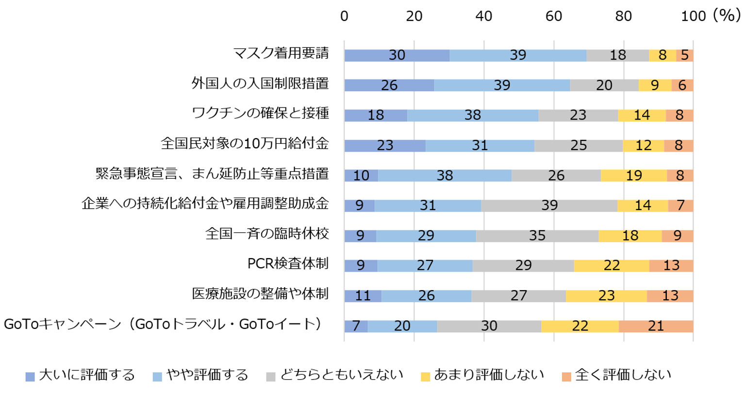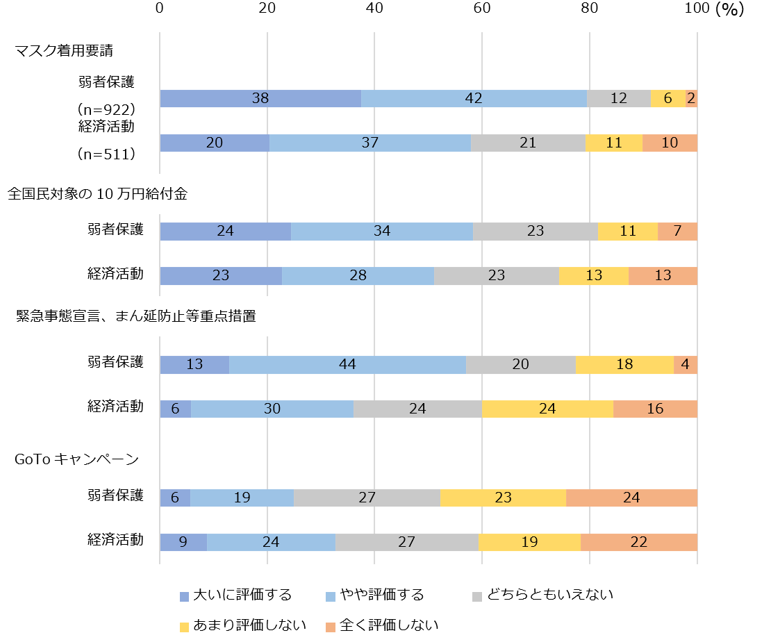 研究報告書 2023.05.29 「コロナ禍の政策と行動から見る日本人の自由と平等観」についてのアンケート(速報) この記事は分で読めます シェア Tweet NIRA総合研究開発機構 ※本調査の個票データはこちら 概要 (公財)NIRA総合研究開発機構では、「コロナ禍の政策と行動から見る日本人の自由と平等観」についてのアンケートを実施した。本調査は、新型コロナウイルス感染拡大時の政策に対する評価や、政府の行動規制に対して異なる立場の意見を読んだ後の考え方の変化を捉えることを目的に実施したものである。パンデミック時の望ましい行動制限やコロナ禍で感じた不公平感から、日本人の自由と平等観を探る。 政府による行動制限として、最も多くの人が支持するのは「自粛要請」だということが明らかになった。その結果について、異なる立場の意見を読む前(熟慮前)と読んだ後(熟慮後)で自粛要請支持の割合を比較すると、熟慮後に支持する割合がさらに増え、50%となった。また、コロナ禍で「医療関係者など、エッセンシャルワーカーに多大な負担がいったこと」については6割強の人が「不公平だと感じる」と回答した。 なお本調査は2022年10月21日(金)~2022年10月24日(月)にかけて行われ、回収数は2,000件、うち有効回答数(トラップ設問をクリアした人)は1,770件であった。以下の速報結果は、トラップ設問(注1)をクリアした人のみを対象とし、「国勢調査(2020年)」の18歳以上の日本人を母集団とみなして、ウェイトによる補正を行った集計結果である(注2)。 速報を読む(2023年5月29日公表) (2.0MB) INDEX Ⅰ調査結果 1.パンデミック時の行動制限 1.1.政府による行動制限 1.2.行動制限における考え方 2.コロナ政策への評価 2.1.望ましい行動制限別にみたコロナ政策への評価 3.日本のお手本となる国 4.マスク着用への期待 4.1.マスクをしていない人への対応 4.2.マスク着用への期待感 4.3.自分がノーマスクだった場合 5.持続化給付金の考え方 6.コロナ禍で感じた不公平感 7.個人情報提出への抵抗感 8.機関・組織への信頼 9.緊急時の政策決定権 Ⅱ調査概要 1.調査の趣旨・目的 2.調査名 3.主な調査項目 4.調査期間 5.調査方法 6.回収数 7.本報告書の集計方法 8.回答者の属性 9.研究体制 ポイント●パンデミック時の政府による行動制限は「自粛要請」が望ましいと考えている人が最も多く、半数近くとなった。●パンデミック時の行動制限における考え方は、経済よりも弱者保護を優先した方が良いと考える人が過半数であった。●「マスク着用要請」、「外国人の入国制限措置」、「ワクチンの確保と接種」、「全国民対象の10万円給付」は過半数の人が肯定的な評価をした。一方、「GoToキャンペーン」は否定的な評価をする人が肯定的な評価をする人の数を上回った。●日本のお手本となる国は、「特にない」との回答が最も多く33%。アメリカや中国がお手本になるとの回答は少なく、どちらも10%未満であった。●マスク着用要請が出ている時、義務ではなくても 65%の人が「ほぼすべての人」にマスク着用を期待することが分かった。●持続化給付金を給付する際は1件ずつの精査をするよりも迅速な対応の方が望ましいと考えている人が多く、47%を占めた。そして、70%の人が給付対象は売上減少などの条件を付けるべきだと考えている。●コロナ禍で起きた出来事で多くの人々が不公平だと感じているのは、「医療関係者など、エッセンシャルワーカーに多大な負担がいったこと」で63%であった。●コロナ禍での対応や情報発信について、「病院」や「保健所」は半数近くの人が信頼している一方、「SNS」や「国会」は信頼していない人が過半数であった。●緊急時における政策の決定権について、「(どちらかといえば、)今よりも地方自治体の権限を強めるべき」と考える人は54%を占め、「(どちらかといえば、)今よりも国の権限を強めるべき」と考える25%を上回った。 図表図1-1-1 政府による望ましい行動制限-熟慮前後での比較-表1-1-2 熟慮前後での意見の変化図1-1-3 年齢別でみた望ましい行動制限図1-2-1 行動制限における考え方-熟慮前後での比較-表1-2-2 熟慮前後での意見の変化図1-2-3 年齢別でみた行動制限における考え方図2 コロナ政策への評価図2-1 望ましい行動制限別にみた、コロナ政策への評価図3 日本のお手本となる国図4-1 マスクをしていない人への対応図4-2-1 マスク着用への期待感図4-2-2 年代別にみた、マスク着用への期待感図4-3 マスク非着用時の感情図5-1 給付プロセス:迅速さか正確さか図5-2 給付対象:条件付きか一律か図6 コロナ禍で感じた不公平感図7 個人情報提出への抵抗感図8 機関・組織への信頼図9 緊急時の政策決定権 Ⅰ調査結果 1.パンデミック時の行動制限 1.1.政府による行動制限 Q3.コロナ禍感染症の拡大を防ぐために、日本では不要不急の外出や飲食店の営業などを自粛する「要請」が出されました。他方、海外では、営業などの行為を「禁止」し、違反時には罰金等を科す国もありました。パンデミックなどの緊急事態におけ