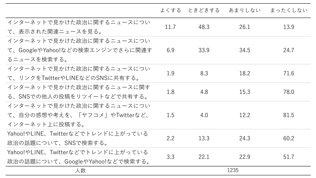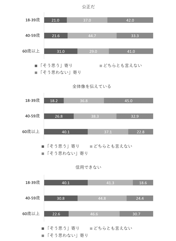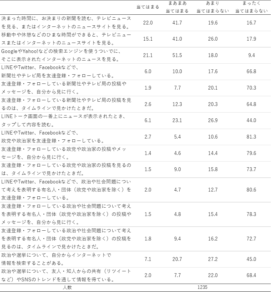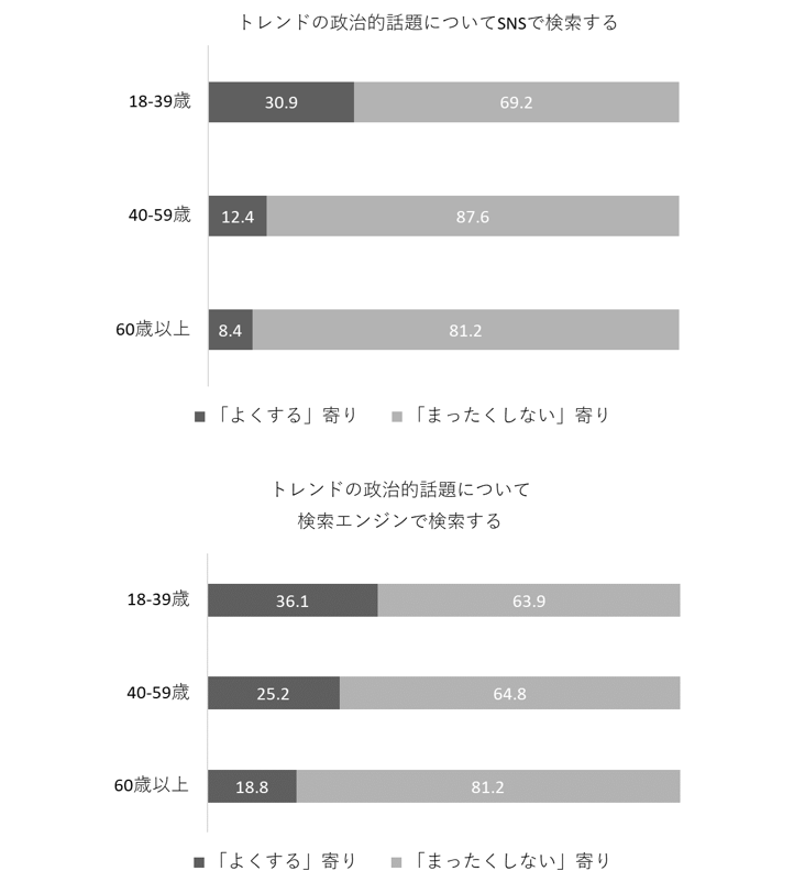 研究報告書 2023.03.08 人々の政治コミュニケーションメディアへの情報接触行動を中心に この記事は分で読めます シェア Tweet 谷口将紀 NIRA総合研究開発機構理事長/東京大学大学院法学政治学研究科教授 大森翔子 NIRA総合研究開発機構研究コーディネーター・研究員 概要 インターネット技術の発達に伴い、人々の情報接触の方法は多様化している。一方で、ネット空間で流通する政治情報に関しては、フェイクニュース、エコーチェンバーといった問題が深刻化している。こうした環境下における人々の情報接触は、世界各地で政治的分断に繋がることが危ぶまれており、日本も決して他人事ではない。本プロジェクトでは、日本における人々の政治コミュニケーションの現在位置について、政治情報接触の方法や経路を明らかにする調査を行った。 調査データを分析した結果、若年層の「新聞離れ」が再確認されたほか、人々が日常生活上のルーティンとしてニュースに接触する傾向は認められるものの、それは定時や余暇にテレビをつける、ポータルサイトを見るといったレベルにとどまり、SNSを通じて能動的に情報を取得する者は、どの世代においてもかなり少ないことなどが明らかになった。情報流通の始めから終わりまでをワン・パッケージで管理することが難しくなった今、民主主義のアリーナとしてあるべき政治コミュニケーション空間のガバナンスについて、官民を超えた議論を始める必要性が高まっている。 エクゼクティブサマリーを読む (194.8KB) PDFで読む (1.4MB) INDEX 第1章 問題の所在と研究の目的 1.はじめに 2.人々の情報接触の動向 3.本プロジェクトの目的 第2章 研究方法 1.調査票の設計 2.調査概要 第3章 分析と結果 1.データ補正について 2.記述統計 3.世代別記述統計 第4章 要約と含意 付録 調査における質問と選択肢 図表表3-1 最もよく利用しているモバイル機器表3-2 「政治、選挙」に関する情報を最も得ている媒体表3-3 ふだんの生活で「よく」接触している媒体(新聞)表3-4 ふだんの生活で「よく」接触している媒体(テレビ)表3-5 ふだんの生活で「よく」接触している媒体(インターネット)表3-6 情報接触の方法表3-7 インターネットを通じた政治ニュース情報接触とその後の行動表3-8 メディアから得られる政治に関する情報の印象(「新聞・テレビ」)表3-9 メディアから得られる政治に関する情報の印象(「Yahoo!ニュース」)表3-10 メディアから得られる政治に関する情報の印象(「Twitter」)表3-11 世代別にみた「政治、選挙」に関する情報を最も得ている媒体表3-12 世代別にみたふだんの生活で「よく」接触している媒体(新聞)表3-13 世代別にみたふだんの生活で「よく」接触している媒体(テレビ)表3-14 世代別にみたふだんの生活で「よく」接触している媒体(インターネット)図3-15 世代別にみた情報接触の方法図3-16 世代別にみたインターネットを通じた政治ニュース情報接触とその後の行動図3-17 世代別にみたメディアから得られる政治に関する情報の印象(「新聞・テレビ」)図3-18 世代別にみたメディアから得られる政治に関する情報の印象(「Yahoo!ニュース」)図3-19 世代別にみたメディアから得られる政治に関する情報の印象(「Twitter」) 第1章 問題の所在と研究の目的 要旨 インターネット技術の発達に伴い、人々の情報接触の方法は多様化している。その利便さが高く評価される一方で、インターネットを介した政治の情報に関しては、フェイクニュース、エコーチェンバーといった問題が深刻化している。こうした情報環境下における人々の情報接触は、自分と意見の異なる人を排除し、国としての合意形成を困難とするような政治的分断に繋がることが危ぶまれており、日本においても決して他人事ではない。そこで本プロジェクトでは、人々の政治情報接触について「リアルな」様態を探ることがますます難しくなっていることを勘案し、人々の政治コミュニケーションの現在位置について、政治情報接触の方法や経路を明らかにする調査を行うことにした。 1.はじめに 民主主義社会における諸問題について、人々が情報を得て、意見を形成するプロセスは不可欠である。そのプロセス次第で、民主主義は健全なものにもなりうるし、逆に恐ろしい暴走をきたすこともありうる。例えば、SNSを介した情報拡散は、#MeTooやBLMといった新しい形態の政治運動に力を与えた一方、アメリカ合衆国議会議事堂襲撃事件のような民主主義の危機にも無視できない役割を担った。人々の情報取得ルートは多種多様だが、中でも(マス)メディアの役割が重要であることは指摘するまでもないだろう。様々なジャンルの情報を人々の理解しやすいように編集し、伝えることが(マス)メディアの使命でもある。 インターネット技術の進化は、(マス)メディアの構造と人々の情報接触行動を大きく変えた。まず、人々は様々な情報へ手軽にアクセスすることが可能になった。従来であれば新聞の朝刊・夕刊、テレビのニュース番組の放送を待