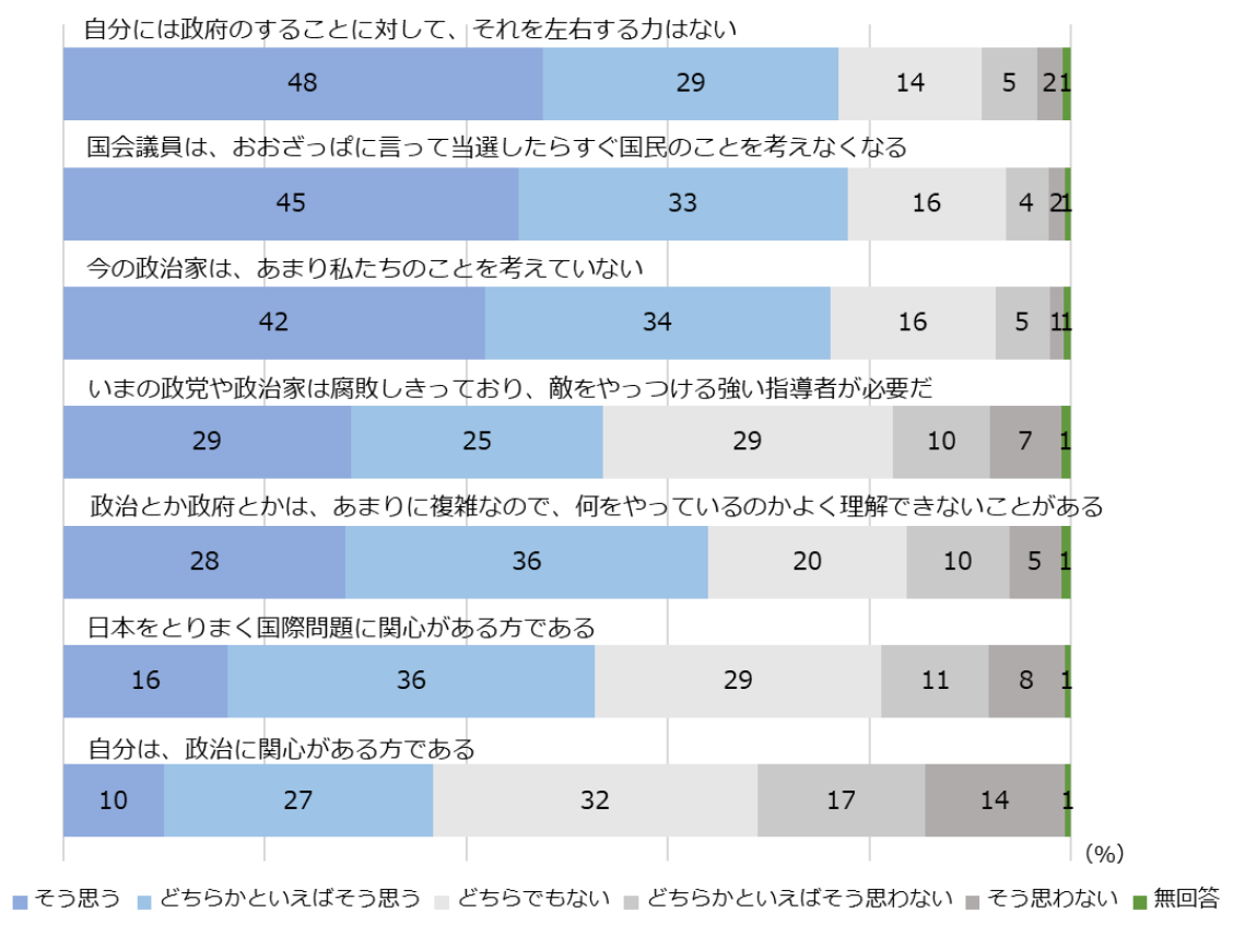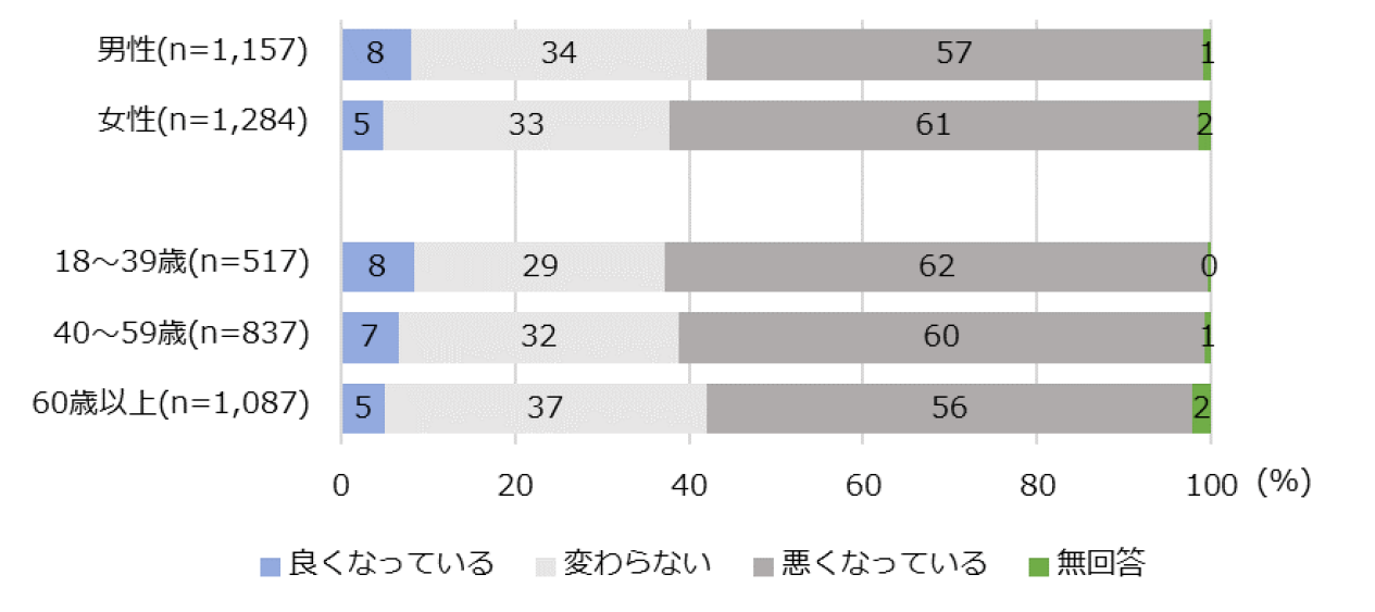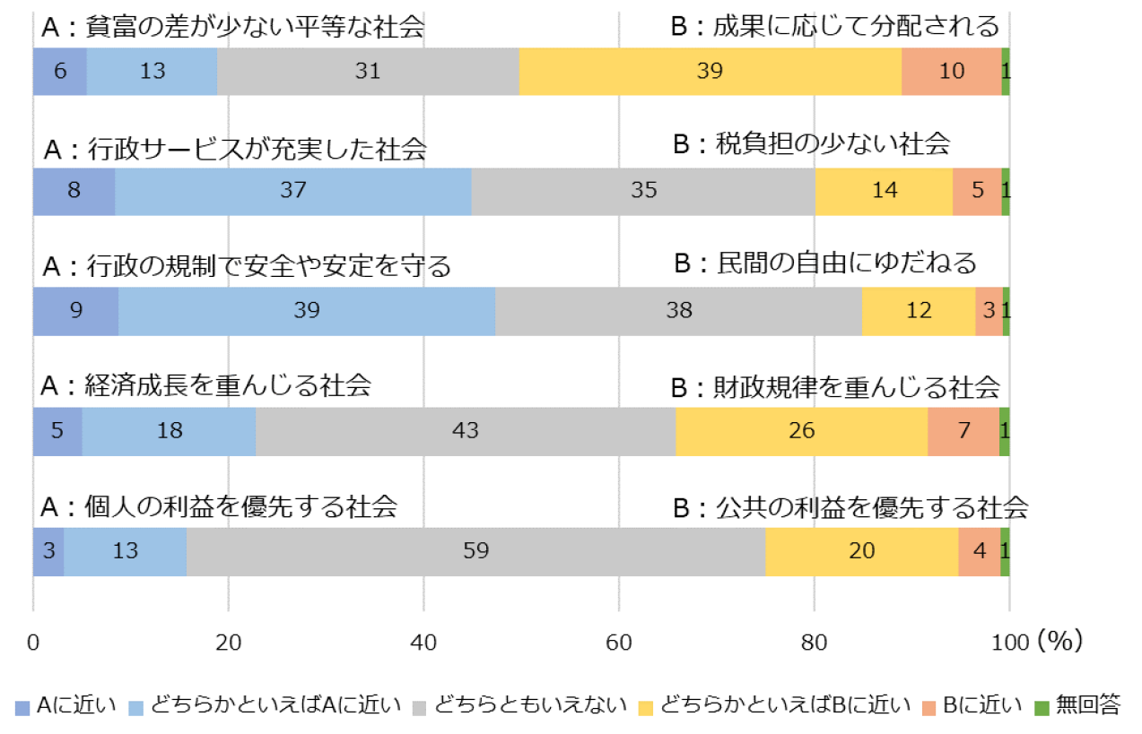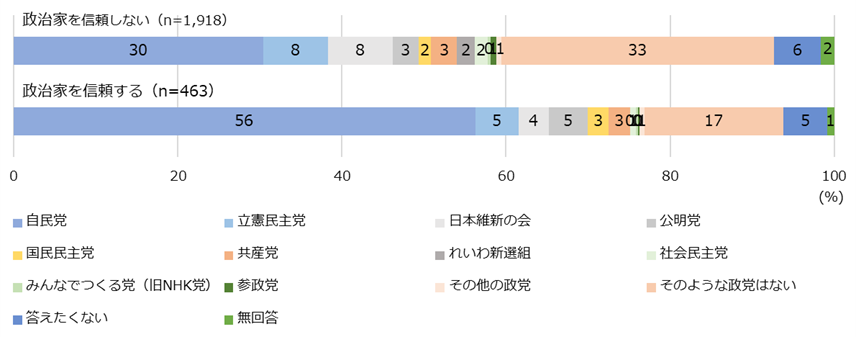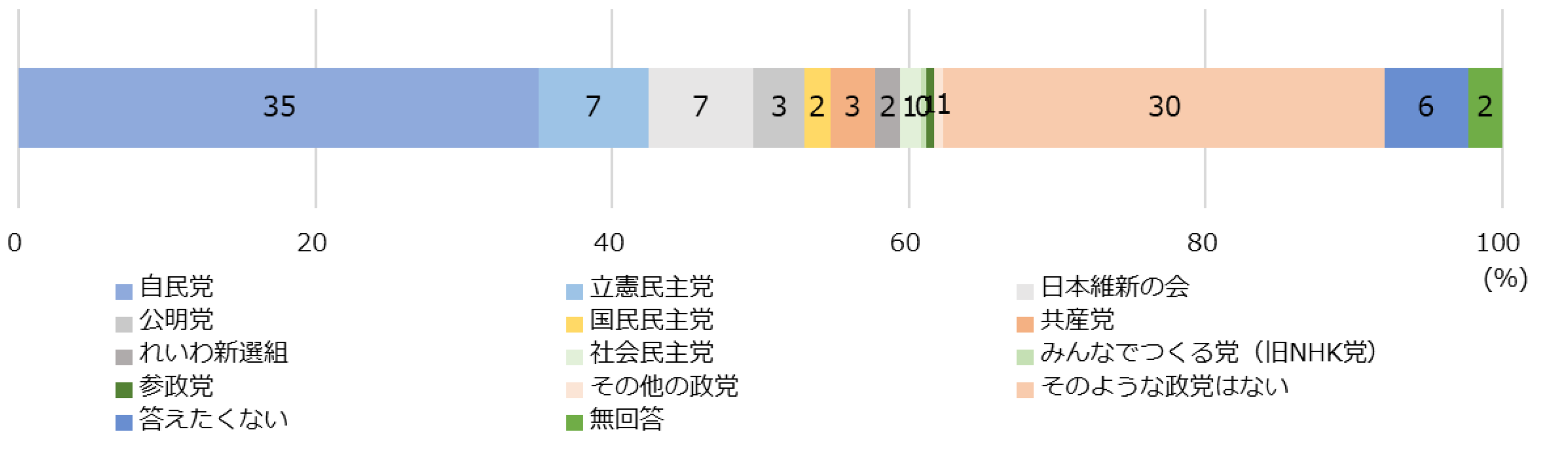 研究報告書 2024.04.26 第2回政治・経済・社会に関する意識調査(NIRA基本調査)(速報) この記事は分で読めます シェア Tweet NIRA総合研究開発機構 最新の調査結果はこちら➡「第3回政治・経済・社会に関する意識調査」 概要 (公財)NIRA総合研究開発機構では、「第2回政治・経済・社会に関する意識調査(NIRA基本調査)」を実施した。本調査は政治・経済・社会に関連する人々の意識を定点観測することを目的としている。今回の調査は昨年に続く第2回目となる。前回は、性別・年齢・居住地域で回収目標数を割り付けたインターネット調査を実施したのに対して、今回は、層化2段無作為抽出に基づく面接調査を主たる調査とし、面接調査を補完するため、面接調査と同一の調査項目、かつ全く同じタイミングで、インターネットでの調査を行った。 この速報は、面接調査について、すべての設問の単純集計と一部の設問についてのクロス集計の結果をまとめたものである(インターネット調査の結果については、後日報告する予定)。 本面接調査は2024年1月19日(金)~2024年2月4日(日)にかけて行われ、回収数は2,441であった。この速報で示されている数値は、すべてウエイトによる補正をしたものである。「国勢調査(2020年)」の18歳以上の日本人を母集団とみなして、性別、年齢(18~39歳、40~59歳、60歳以上の3段階)、都市規模(21大都市に居住しているか否か)の3属性で、レイキング法によって補正した。また、この速報のグラフ中の数字はすべて四捨五入したものである。そのため、グラフ中の数字の合計が100%にならなかったり、本文中の数字と一致しなかったりすることがある。 速報を読む(2024年4月26公表) (2.7MB) INDEX Ⅰ 調査結果 1.政治分野 1.1.投票予定政党と長期的党派性 1.2.諸外国への親近感 1.3.組織などへの信頼度と理由 1.4.政治的有効性感覚・ポピュリズム態度 2.経済分野 2.1.世帯の家計状況、日本の経済状況の変化 2.2.世帯の家計状況、日本の経済状況の見通し 2.3.個人を取り巻く状況への見通し 2.4.日本社会を取り巻く状況への見通し 2.5.デジタル化や技術革新の影響に関する認識 2.6.生活時間 2.7.情報メディア 2.8.地域、ボランティア、副業に関する活動状況 2.9.環境に配慮した活動 3.社会分野 3.1.社会に対する考え方 3.2.公的サービスに対する考え方 3.3.人々の社会意識 Ⅱ 調査概要 1.調査の趣旨・目的 2.調査名 3.主な調査項目 4.調査期間 5.調査方法 6.回収数 7.本報告書の集計方法 8.研究体制 ポイント●長期的党派性として、自民党を支持すると答えた人は全体の35%であり、立憲民主党と日本維新の会(いずれも7%)がそれに続く。「そのような政党はない」と答えた人は全体の30%であった。●政治家を「非常に信頼する」あるいは「信頼する」と回答した人は、全体の20%程度にとどまった。政治家を信頼する層としない層では、自民党を支持する人の割合がそれぞれ56%と30%と、大きな差があった。●「いまの政党や政治家は腐敗しており敵をやっつける強い指導者が必要だ」という質問に「そう思う」あるいは「どちらかといえばそう思う」と答えた人は全体の54%に及んでおり、その背後にはポピュリズム的な態度があると推察される。●5~10年後の経済状況について悲観視する人が多く、世帯の家計状況が「悪くなっている」と回答した人の割合は50%近くになり、日本の経済状況が「悪くなっている」と回答した人の割合は60%近い。●日本社会を取り巻く状況への見通しや、デジタル化や技術革新がもたらす影響について、全体的にネガティブな回答が多い。例えば、異常気象や大規模災害の発生、物価上昇による生活苦については、80%を超える人が起こりそうという認識を持っている。●情報メディアについては、若年層ほどSNS、高齢層ほどテレビへの接触時間が長い。若年層は、SNSへの信頼がない人でも、メディア接触時間としてSNSが最も長い人は半数を上回る。●理想の日本社会について尋ねたところ、自由に競争し、成果に応じて分配される社会を支持する人が多く、割合は49%となった。一方で、税を負担しても福祉などの行政サービスを充実させ、行政機関による規制を通じて人びとの生活の安全と経済の安定を守る社会を理想とする声も、それぞれ半数程度あった。公共と個人の利益のどちらを優先させるかという質問については、「どちらともいえない」と答える人が最も多く59%だった。●公的サービスの内容について、最も多くの人が理解していた項目は、医療サービス(47%)と年金制度(45%)だったが、「公的サービスの満足度」を尋ねる質問では、医療サービスへの満足度が高いことに比べ、年金制度の満足度は著しく低い結果となった。●公的サービスの質や給付を充実させるために、自身の税・社会保険料の負担が増えてもよいものを聞いたところ、最も優先度の高い項目として、年齢別で18歳から30代は「子育て支援」、40代以上は「年金」を選ぶ人が多かった。●国や自治体のサービスで、無駄な支出が少ないと思っている人が最も