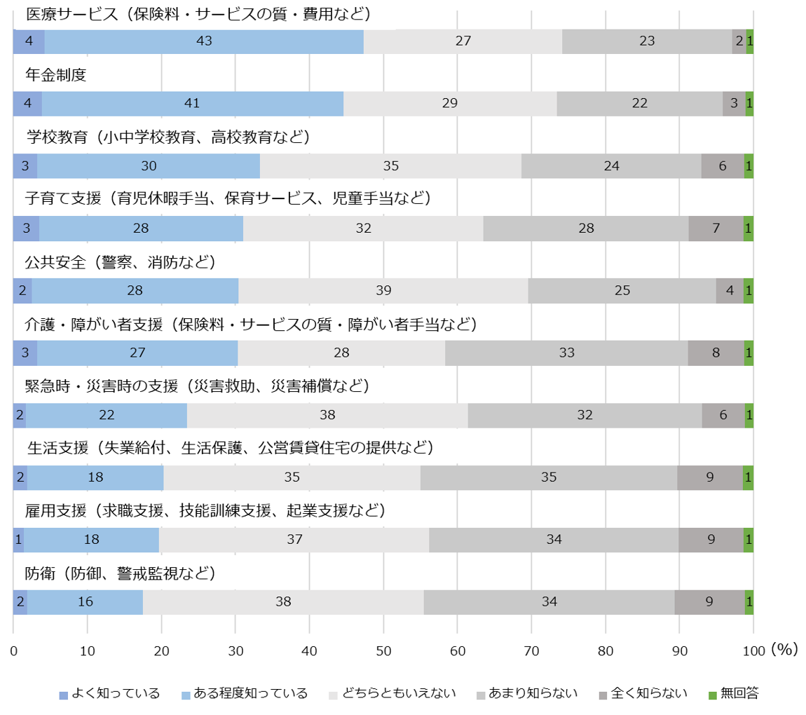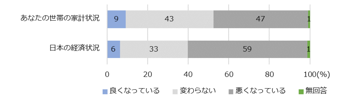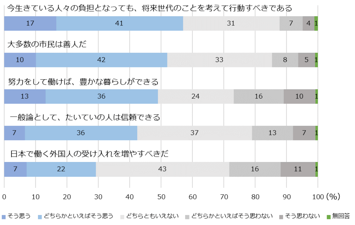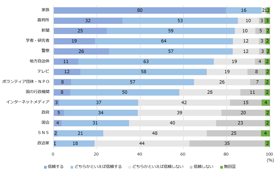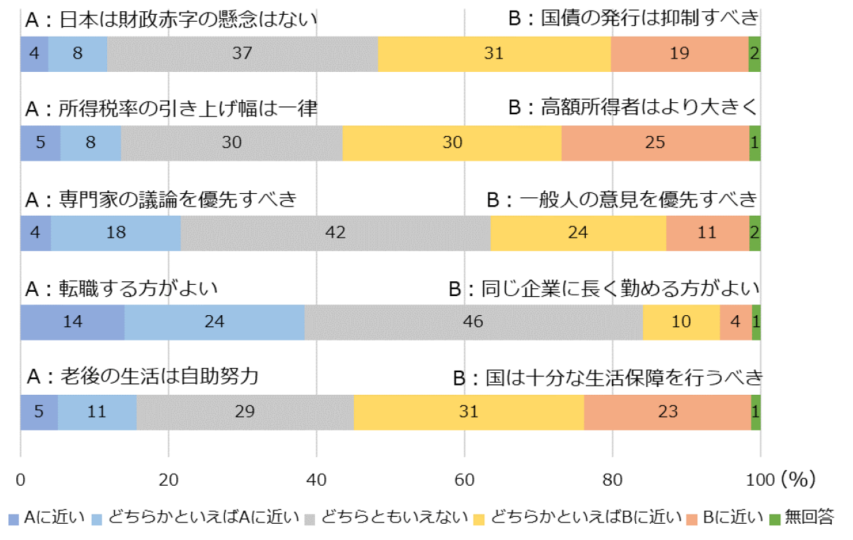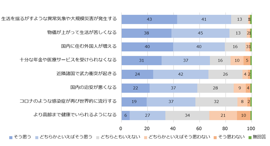 研究報告書 2024.04.26 第2回政治・経済・社会に関する意識調査(NIRA基本調査)(速報) この記事は分で読めます シェア Tweet NIRA総合研究開発機構 最新の調査結果はこちら➡「第3回政治・経済・社会に関する意識調査」 概要 (公財)NIRA総合研究開発機構では、「第2回政治・経済・社会に関する意識調査(NIRA基本調査)」を実施した。本調査は政治・経済・社会に関連する人々の意識を定点観測することを目的としている。今回の調査は昨年に続く第2回目となる。前回は、性別・年齢・居住地域で回収目標数を割り付けたインターネット調査を実施したのに対して、今回は、層化2段無作為抽出に基づく面接調査を主たる調査とし、面接調査を補完するため、面接調査と同一の調査項目、かつ全く同じタイミングで、インターネットでの調査を行った。 この速報は、面接調査について、すべての設問の単純集計と一部の設問についてのクロス集計の結果をまとめたものである(インターネット調査の結果については、後日報告する予定)。 本面接調査は2024年1月19日(金)~2024年2月4日(日)にかけて行われ、回収数は2,441であった。この速報で示されている数値は、すべてウエイトによる補正をしたものである。「国勢調査(2020年)」の18歳以上の日本人を母集団とみなして、性別、年齢(18~39歳、40~59歳、60歳以上の3段階)、都市規模(21大都市に居住しているか否か)の3属性で、レイキング法によって補正した。また、この速報のグラフ中の数字はすべて四捨五入したものである。そのため、グラフ中の数字の合計が100%にならなかったり、本文中の数字と一致しなかったりすることがある。 速報を読む(2024年4月26公表) (2.7MB) INDEX Ⅰ 調査結果 1.政治分野 1.1.投票予定政党と長期的党派性 1.2.諸外国への親近感 1.3.組織などへの信頼度と理由 1.4.政治的有効性感覚・ポピュリズム態度 2.経済分野 2.1.世帯の家計状況、日本の経済状況の変化 2.2.世帯の家計状況、日本の経済状況の見通し 2.3.個人を取り巻く状況への見通し 2.4.日本社会を取り巻く状況への見通し 2.5.デジタル化や技術革新の影響に関する認識 2.6.生活時間 2.7.情報メディア 2.8.地域、ボランティア、副業に関する活動状況 2.9.環境に配慮した活動 3.社会分野 3.1.社会に対する考え方 3.2.公的サービスに対する考え方 3.3.人々の社会意識 Ⅱ 調査概要 1.調査の趣旨・目的 2.調査名 3.主な調査項目 4.調査期間 5.調査方法 6.回収数 7.本報告書の集計方法 8.研究体制 ポイント●長期的党派性として、自民党を支持すると答えた人は全体の35%であり、立憲民主党と日本維新の会(いずれも7%)がそれに続く。「そのような政党はない」と答えた人は全体の30%であった。●政治家を「非常に信頼する」あるいは「信頼する」と回答した人は、全体の20%程度にとどまった。政治家を信頼する層としない層では、自民党を支持する人の割合がそれぞれ56%と30%と、大きな差があった。●「いまの政党や政治家は腐敗しており敵をやっつける強い指導者が必要だ」という質問に「そう思う」あるいは「どちらかといえばそう思う」と答えた人は全体の54%に及んでおり、その背後にはポピュリズム的な態度があると推察される。●5~10年後の経済状況について悲観視する人が多く、世帯の家計状況が「悪くなっている」と回答した人の割合は50%近くになり、日本の経済状況が「悪くなっている」と回答した人の割合は60%近い。●日本社会を取り巻く状況への見通しや、デジタル化や技術革新がもたらす影響について、全体的にネガティブな回答が多い。例えば、異常気象や大規模災害の発生、物価上昇による生活苦については、80%を超える人が起こりそうという認識を持っている。●情報メディアについては、若年層ほどSNS、高齢層ほどテレビへの接触時間が長い。若年層は、SNSへの信頼がない人でも、メディア接触時間としてSNSが最も長い人は半数を上回る。●理想の日本社会について尋ねたところ、自由に競争し、成果に応じて分配される社会を支持する人が多く、割合は49%となった。一方で、税を負担しても福祉などの行政サービスを充実させ、行政機関による規制を通じて人びとの生活の安全と経済の安定を守る社会を理想とする声も、それぞれ半数程度あった。公共と個人の利益のどちらを優先させるかという質問については、「どちらともいえない」と答える人が最も多く59%だった。●公的サービスの内容について、最も多くの人が理解していた項目は、医療サービス(47%)と年金制度(45%)だったが、「公的サービスの満足度」を尋ねる質問では、医療サービスへの満足度が高いことに比べ、年金制度の満足度は著しく低い結果となった。●公的サービスの質や給付を充実させるために、自身の税・社会保険料の負担が増えてもよいものを聞いたところ、最も優先度の高い項目として、年齢別で18歳から30代は「子育て支援」、40代以上は「年金」を選ぶ人が多かった。●国や自治体のサービスで、無駄な支出が少ないと思っている人が最も