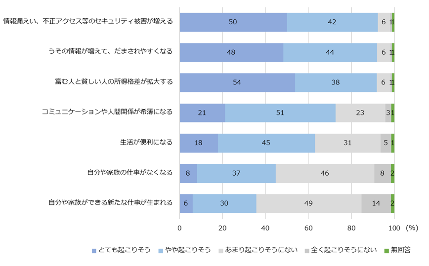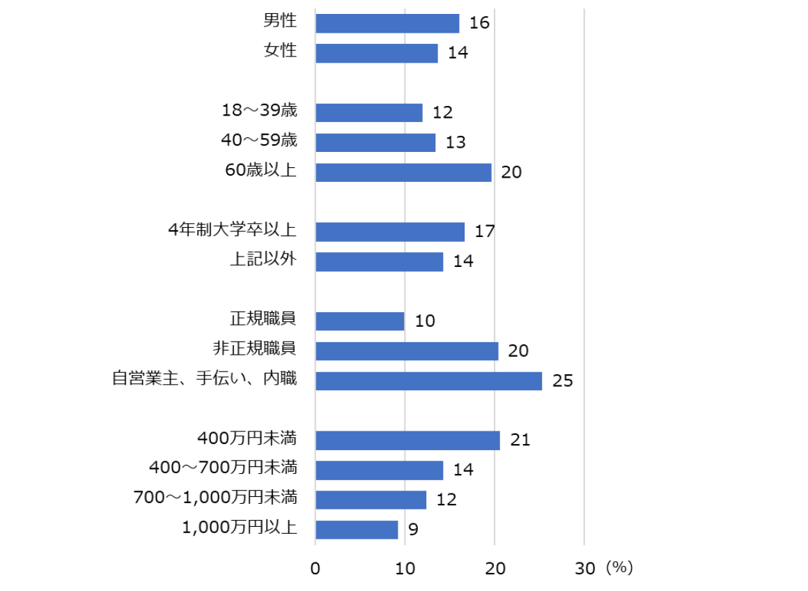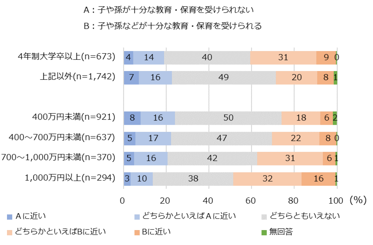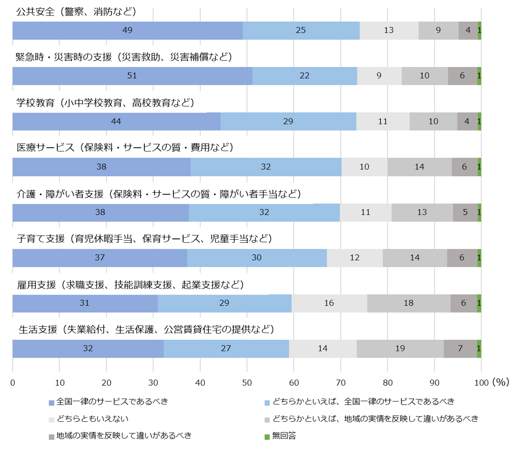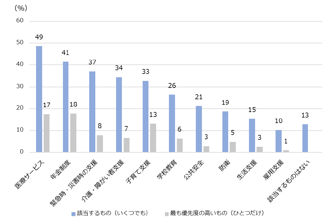 研究報告書 2024.04.26 第2回政治・経済・社会に関する意識調査(NIRA基本調査)(速報) この記事は分で読めます シェア Tweet NIRA総合研究開発機構 最新の調査結果はこちら➡「第3回政治・経済・社会に関する意識調査」 概要 (公財)NIRA総合研究開発機構では、「第2回政治・経済・社会に関する意識調査(NIRA基本調査)」を実施した。本調査は政治・経済・社会に関連する人々の意識を定点観測することを目的としている。今回の調査は昨年に続く第2回目となる。前回は、性別・年齢・居住地域で回収目標数を割り付けたインターネット調査を実施したのに対して、今回は、層化2段無作為抽出に基づく面接調査を主たる調査とし、面接調査を補完するため、面接調査と同一の調査項目、かつ全く同じタイミングで、インターネットでの調査を行った。 この速報は、面接調査について、すべての設問の単純集計と一部の設問についてのクロス集計の結果をまとめたものである(インターネット調査の結果については、後日報告する予定)。 本面接調査は2024年1月19日(金)~2024年2月4日(日)にかけて行われ、回収数は2,441であった。この速報で示されている数値は、すべてウエイトによる補正をしたものである。「国勢調査(2020年)」の18歳以上の日本人を母集団とみなして、性別、年齢(18~39歳、40~59歳、60歳以上の3段階)、都市規模(21大都市に居住しているか否か)の3属性で、レイキング法によって補正した。また、この速報のグラフ中の数字はすべて四捨五入したものである。そのため、グラフ中の数字の合計が100%にならなかったり、本文中の数字と一致しなかったりすることがある。 速報を読む(2024年4月26公表) (2.7MB) INDEX Ⅰ 調査結果 1.政治分野 1.1.投票予定政党と長期的党派性 1.2.諸外国への親近感 1.3.組織などへの信頼度と理由 1.4.政治的有効性感覚・ポピュリズム態度 2.経済分野 2.1.世帯の家計状況、日本の経済状況の変化 2.2.世帯の家計状況、日本の経済状況の見通し 2.3.個人を取り巻く状況への見通し 2.4.日本社会を取り巻く状況への見通し 2.5.デジタル化や技術革新の影響に関する認識 2.6.生活時間 2.7.情報メディア 2.8.地域、ボランティア、副業に関する活動状況 2.9.環境に配慮した活動 3.社会分野 3.1.社会に対する考え方 3.2.公的サービスに対する考え方 3.3.人々の社会意識 Ⅱ 調査概要 1.調査の趣旨・目的 2.調査名 3.主な調査項目 4.調査期間 5.調査方法 6.回収数 7.本報告書の集計方法 8.研究体制 ポイント●長期的党派性として、自民党を支持すると答えた人は全体の35%であり、立憲民主党と日本維新の会(いずれも7%)がそれに続く。「そのような政党はない」と答えた人は全体の30%であった。●政治家を「非常に信頼する」あるいは「信頼する」と回答した人は、全体の20%程度にとどまった。政治家を信頼する層としない層では、自民党を支持する人の割合がそれぞれ56%と30%と、大きな差があった。●「いまの政党や政治家は腐敗しており敵をやっつける強い指導者が必要だ」という質問に「そう思う」あるいは「どちらかといえばそう思う」と答えた人は全体の54%に及んでおり、その背後にはポピュリズム的な態度があると推察される。●5~10年後の経済状況について悲観視する人が多く、世帯の家計状況が「悪くなっている」と回答した人の割合は50%近くになり、日本の経済状況が「悪くなっている」と回答した人の割合は60%近い。●日本社会を取り巻く状況への見通しや、デジタル化や技術革新がもたらす影響について、全体的にネガティブな回答が多い。例えば、異常気象や大規模災害の発生、物価上昇による生活苦については、80%を超える人が起こりそうという認識を持っている。●情報メディアについては、若年層ほどSNS、高齢層ほどテレビへの接触時間が長い。若年層は、SNSへの信頼がない人でも、メディア接触時間としてSNSが最も長い人は半数を上回る。●理想の日本社会について尋ねたところ、自由に競争し、成果に応じて分配される社会を支持する人が多く、割合は49%となった。一方で、税を負担しても福祉などの行政サービスを充実させ、行政機関による規制を通じて人びとの生活の安全と経済の安定を守る社会を理想とする声も、それぞれ半数程度あった。公共と個人の利益のどちらを優先させるかという質問については、「どちらともいえない」と答える人が最も多く59%だった。●公的サービスの内容について、最も多くの人が理解していた項目は、医療サービス(47%)と年金制度(45%)だったが、「公的サービスの満足度」を尋ねる質問では、医療サービスへの満足度が高いことに比べ、年金制度の満足度は著しく低い結果となった。●公的サービスの質や給付を充実させるために、自身の税・社会保険料の負担が増えてもよいものを聞いたところ、最も優先度の高い項目として、年齢別で18歳から30代は「子育て支援」、40代以上は「年金」を選ぶ人が多かった。●国や自治体のサービスで、無駄な支出が少ないと思っている人が最も